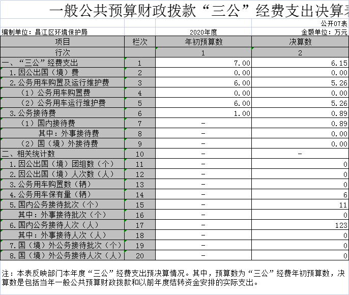 三、“三公”经费支出:反映昌江生态环境局2020年度“三公”经费开支情况,包括出国出境费、接待费、公务用车运行维护费。