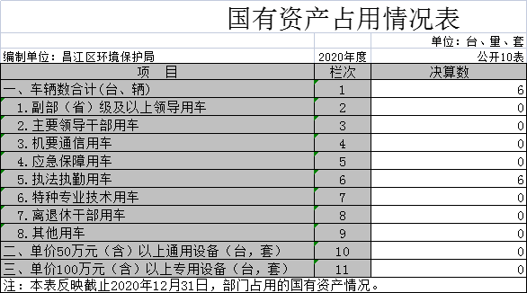 截至2020年12月31日,本部门共有车辆0辆,其中,副部(省)级及以上领导用车0辆、主要领导干部用车0辆、机要通信用车0辆、应急保障用车0辆、执法执勤用车0辆、特种专业技术用车0辆、其他用车6辆;单位价值50万元以上通用设备0台(套);单位价值100万元以上专用设备0台(套)。