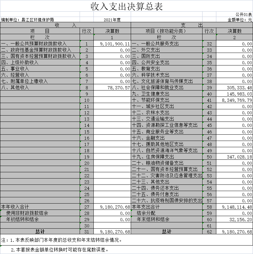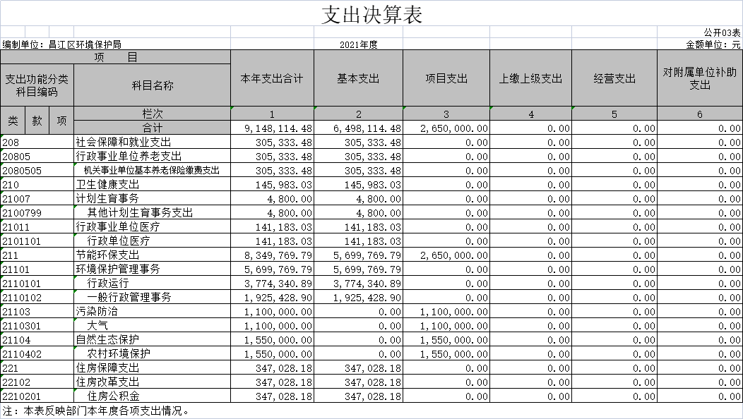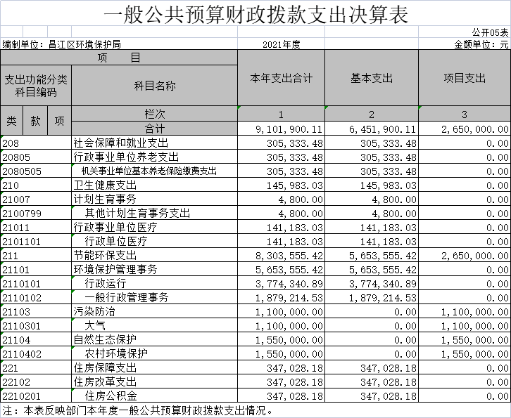 本单位2021年度支出总计918.03万元,其中本年支出合计914.81万元,较2020年减少1301.9万元,下降58.73%,主要原因是:项目资金投入下降,2020年投入的两个项目支出1640万元,分别是水污染防治资金900万元、水质自动监测站项目740万元;2021年投入的两个项目支出265万元,分别是大气环境污染治理110万元、农村环境治理155万元;年末结转和结余3.22万元,较2020年增加3.22万元,主要原因是:财政收回存量资金,致上年无年末结转结余。