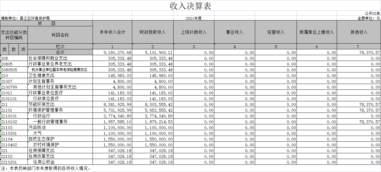 本单位2021年度收入总计918.03万元,其中年初结转和结余0万元,较2020年减少1298.71万元,下降58.59%;本年收入合计918.03万元,较2020年减少1202.18万元,下降56.7%,主要原因是项目资金投入下降,2020年投入的两个项目支出1640万元,分别是水污染防治资金900万元、水质自动监测站项目740万元;2021年投入的两个项目支出265万元,分别是大气环境污染治理110万元、农村环境治理155万元。导致整体收入下降。