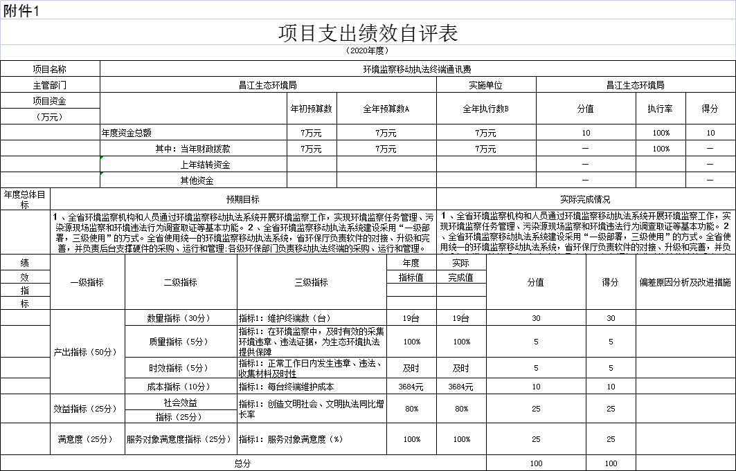 “环境整治”项目绩效自评综述:根据年初设定的绩效目标,项目绩效自评得分为100分。项目全年预算数为16万元,执行数为16万元,完成预算的 100 %。主要产出和效果:一是实现环境和经济协调发展,促进经济又好又快发展,二是促进企业转型升级,引导企业由粗加工到深加工发展。发现的问题及原因:通过此次专项绩效评估,认为现有评估指标系统特别是指标设置与考核标准可根据工作实际进一步改进和完善。下一步改进措施:进一步改进和完善指标设置与考核标准。