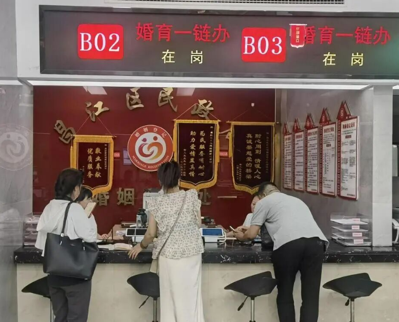 “本来以为结婚登记要跑民政局,户口迁移要跑派出所,来来回回得折腾好几趟,没想到在这一个窗口就全办完了!”2025年6月19日,新婚夫妻黄先生和张女士在昌江区行政服务中心“婚育一链办”窗口,通过“结婚落户一件事”服务,顺利完成结婚登记与户口迁移,惊喜不已。