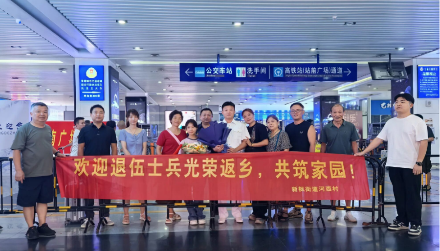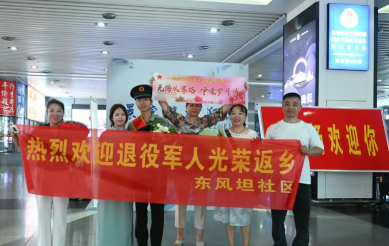 在景德镇北站出站口,工作人员早已在迎接站点等待。现场悬挂“欢迎退役军人光荣返乡”等醒目横幅,同步发放退役军人报到指南,营造出庄重而热烈的氛围。工作人员为走出站口的退役军人献上鲜花、披挂“光荣返乡”绶带,主动接过厚重行李,以细致入微的关怀让退役军人刚踏上家乡土地就感受到“回家”的温暖。退役士兵们纷纷表示,将永葆军人本色,以实际行动诠释“退役不褪色、转岗不转志”的誓言,为昌江区发展再立新功。