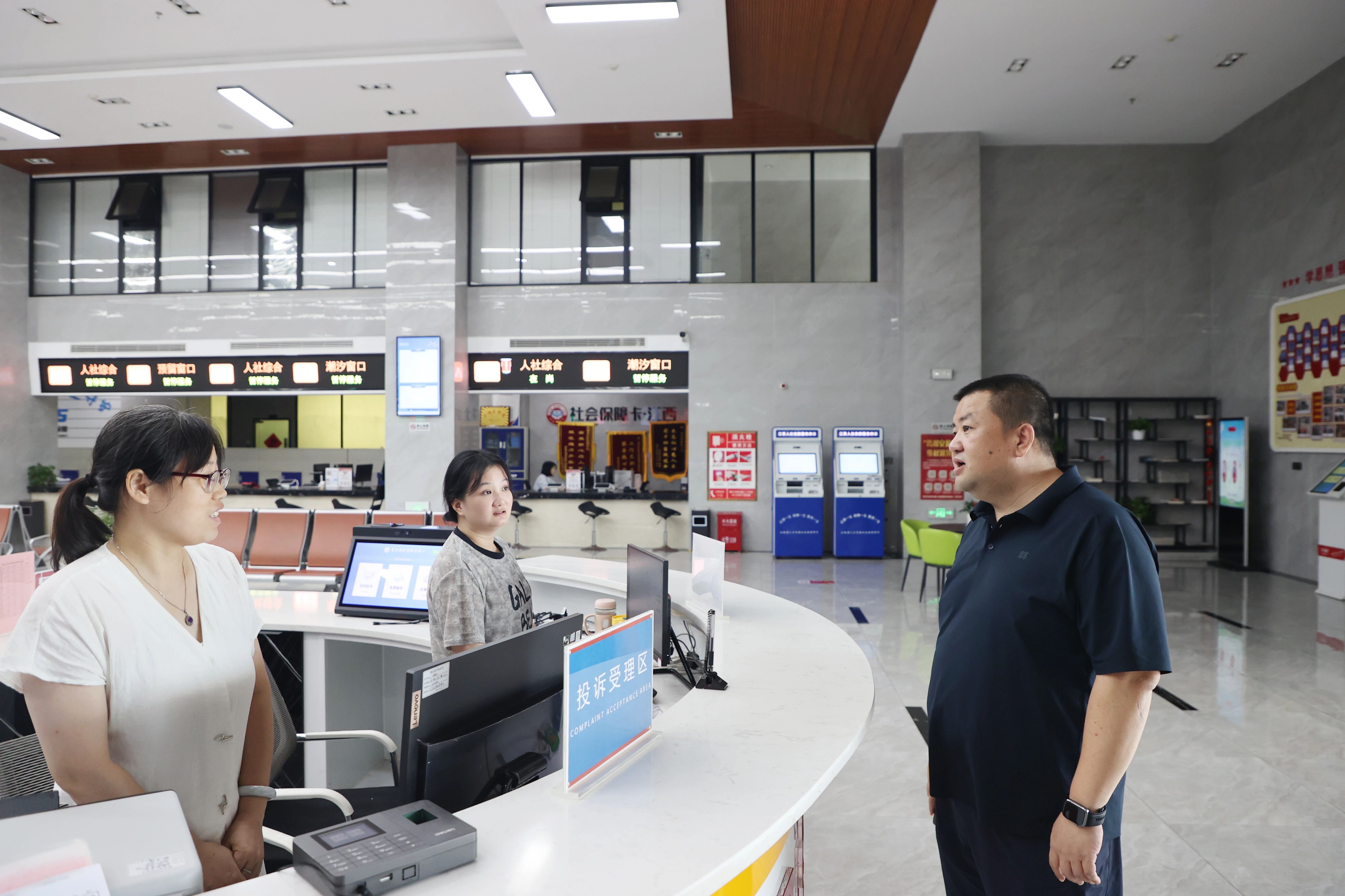 在区行政服务中心,伊文斌与值班人员亲切交谈,详细询问假期服务事项办理、人员轮岗值守、应急处置准备等情况,仔细查阅值班记录与群众诉求台账。在市监、人社服务等便民窗口,伊文斌与前来办事的群众交流,了解假期办事体验,当得知“跨区通办”“容缺受理”等举措有效解决了群众急难问题时,对中心假期服务保障工作给予肯定。
