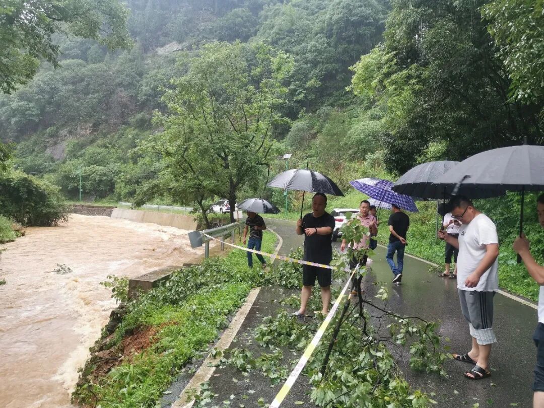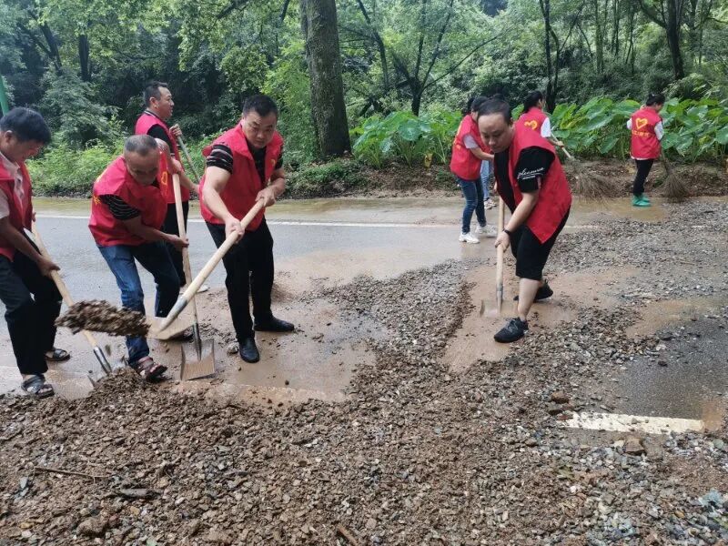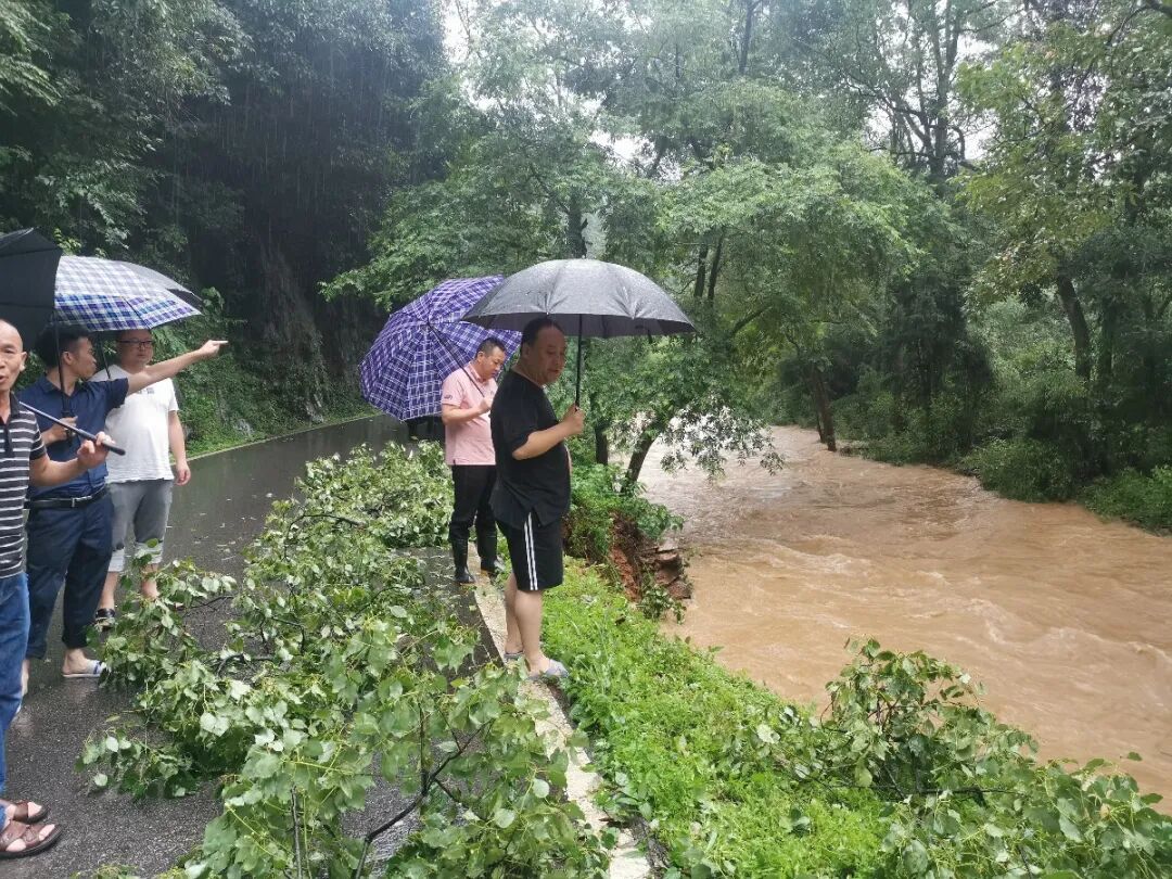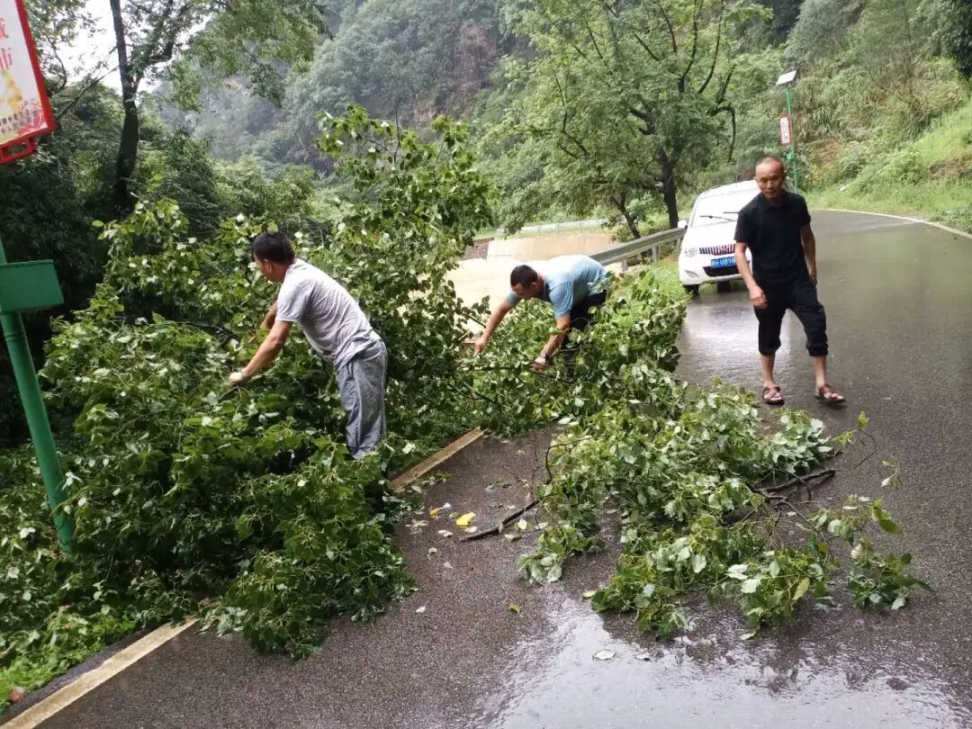 山门村泉水洼附近一棵树被洪水冲倒,山门村委及时清理路障,拉起警界线;杨湾村党员突击队赴刘家、李家山、百叶等村组巡查,沿途疏通河道;仓下村、童坊村夜夜值守......