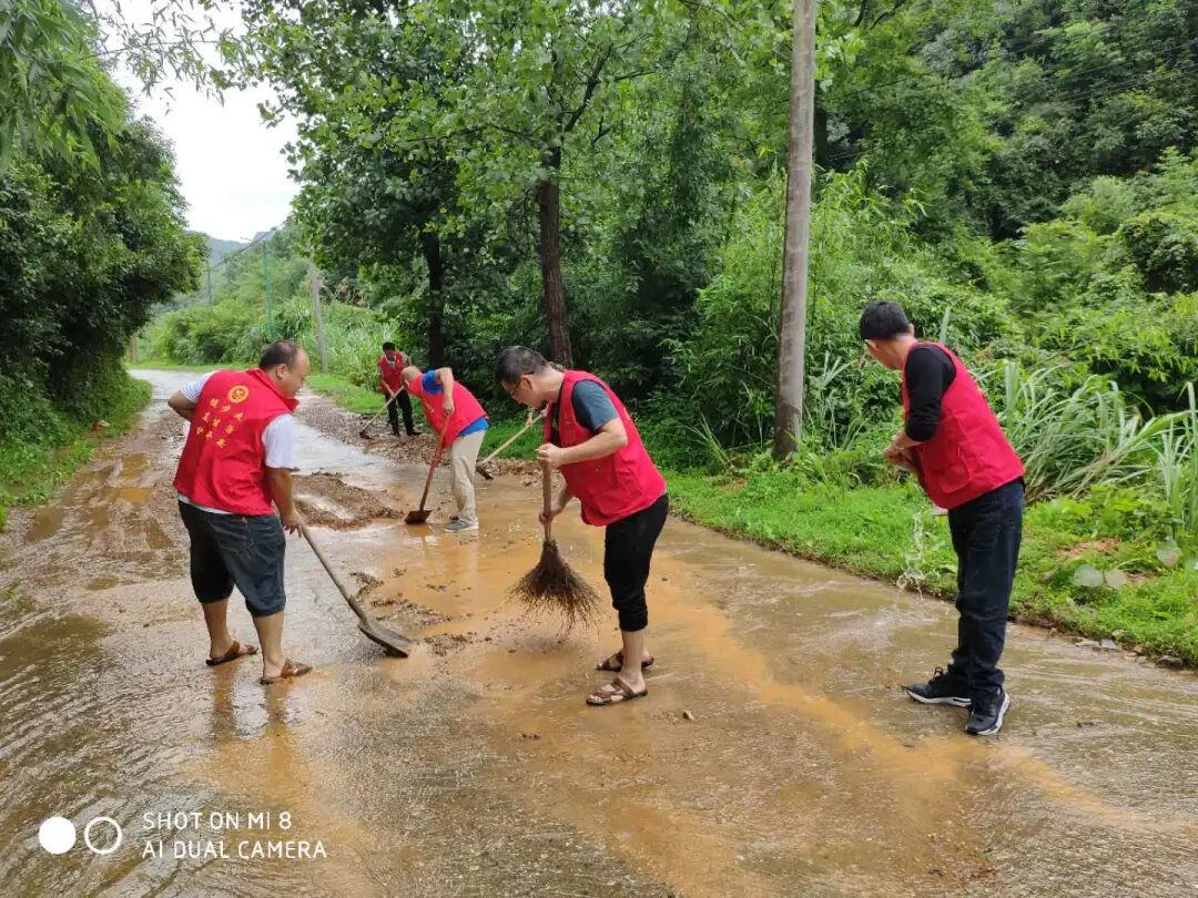 路面堆积了许多黄泥巴,荷塘乡组织党员志愿者开展“灾后卫生清理,环境消杀运动”,确保灾后环境得到及时清理,灾后无大疫。