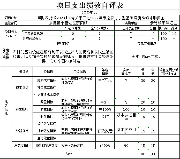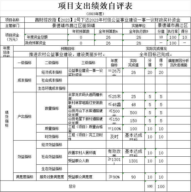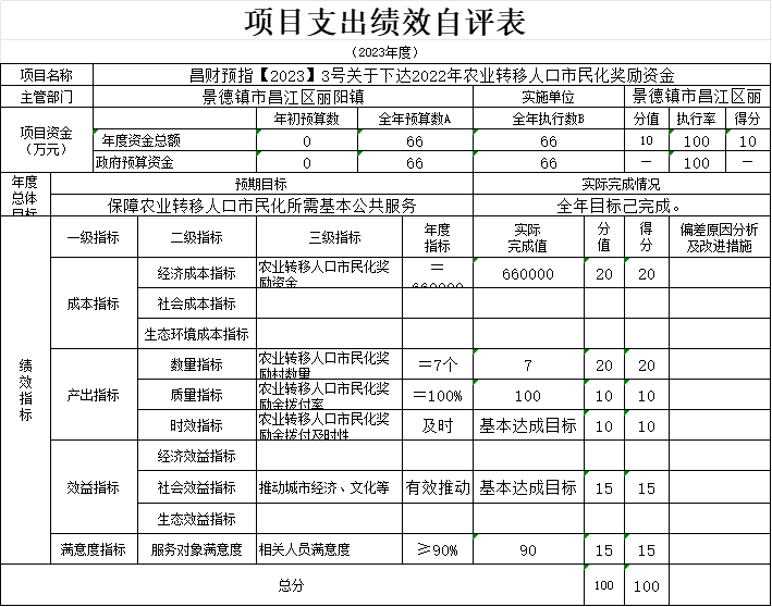 丽阳镇人民政府(本级)“昌财预指【2023】3号关于下达2022年农业转移人口市民化奖励资金,昌财综改指【2023】2号关于下达2023年村级公益事业一事一议财政奖补资金,昌财农指【2023】1号关于下达2022年市级农村小型基础设施维修补助资金项目支出绩效自评表如下: