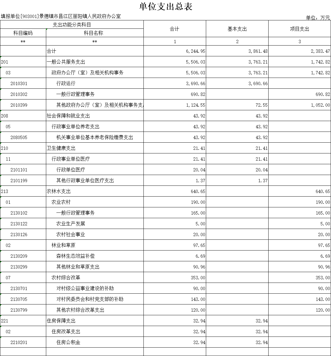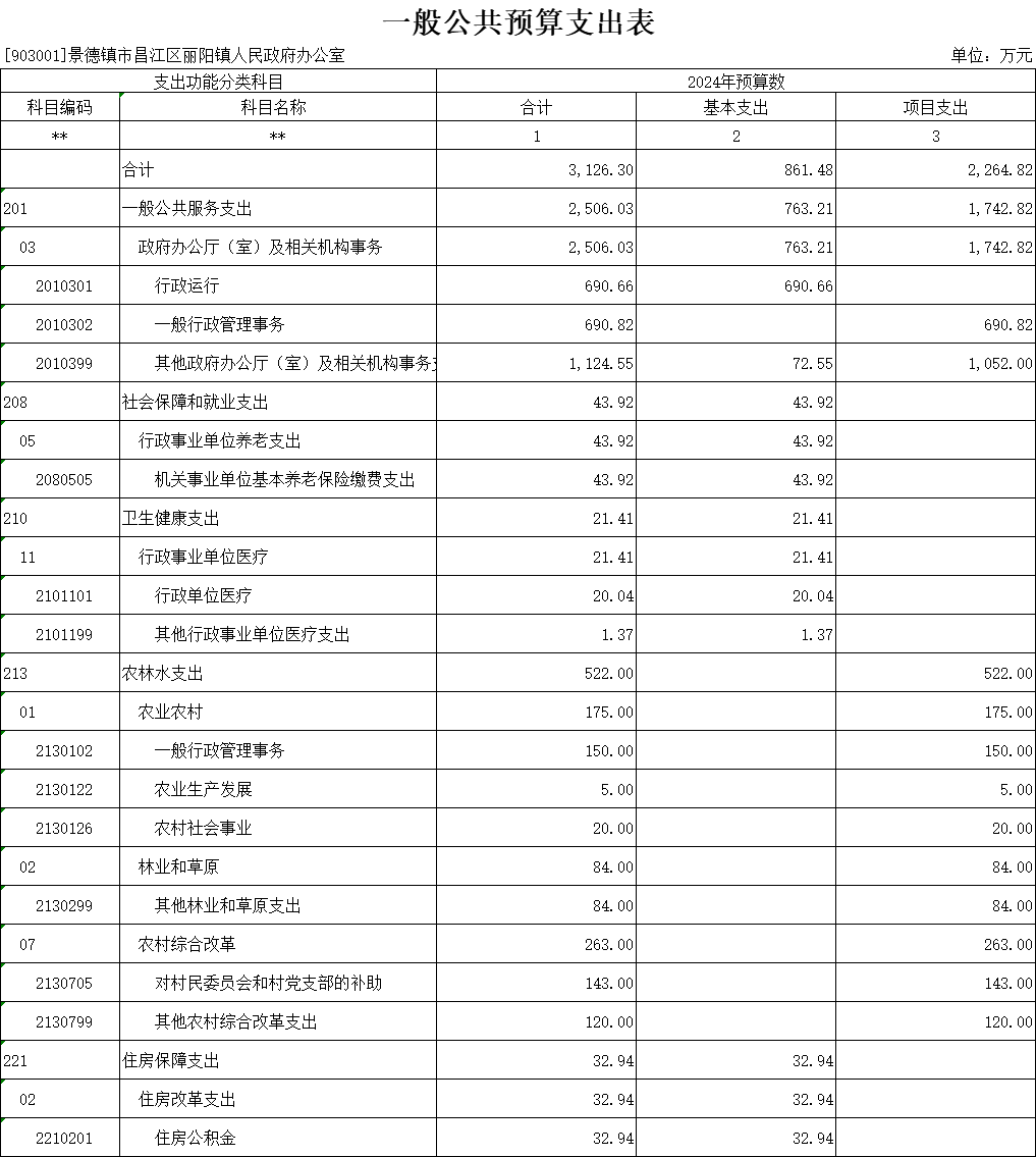 按支出功能科目划分:一般公共服务支出2506.03万元;社会保障和就业支出43.92万元;卫生健康支出21.41万元;农林水支出522万元;住房保障支出32.94万元;