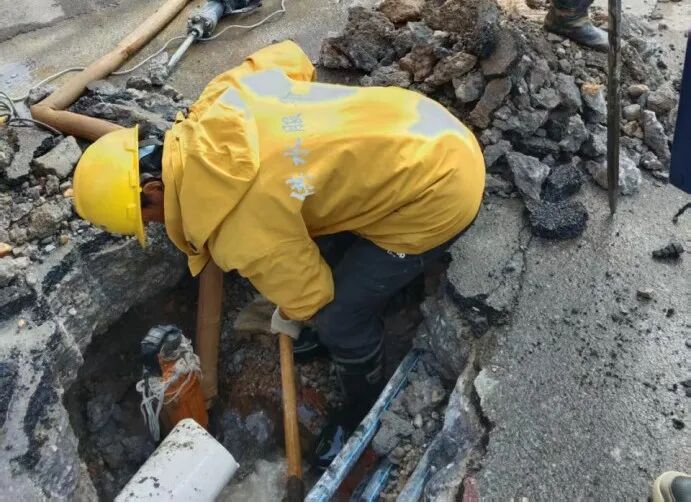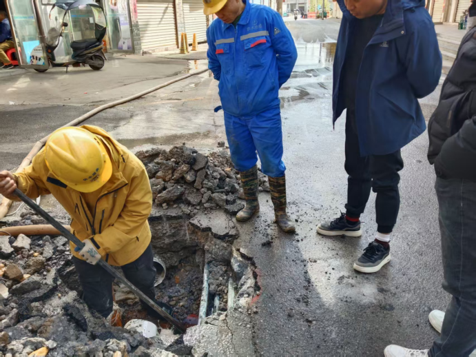 社区工作人员第一时间联系供水抢修队伍,身着黄色“供水服务”标识工作服、蓝色作业服的抢修人员携带电钻、铁锹等工具迅速到场。作业人员分工开挖破损路面、清理作业区域,部分人员下至坑内检修破裂管道;社区工作人员同步协调周边秩序,避免过往行人和车辆受施工影响。