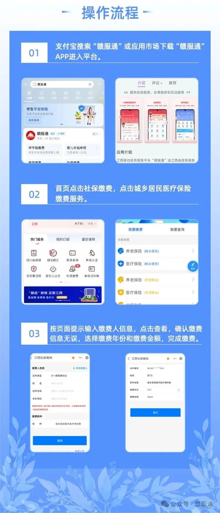 江西省2026年度城乡居民基本医疗保险集中缴费期为2025年10月15日至2026年2月28日,缴费标准为每人每年400元。“赣服通”提供城乡居民医保缴费服务,为了不影响您的医保待遇享受,请记得及时缴费。