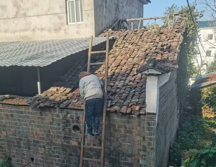 了解情况后,余家村高度重视,第一时间召开会议,敲定厨房屋顶修整方案,明确“快推进、保质量”的工作要求,当天便协调施工队进场作业。为从根本上解决漏水问题,余家村全程跟进施工:从铲除老化防水层、修补屋面裂缝,到铺设新的防水卷材、加固屋面结构,每一个环节都紧盯安全与细节;同时考虑到王某的脱贫户身份,余家村协调承担了全部修整材料与人工费用,让她“零负担”享受到民生保障。