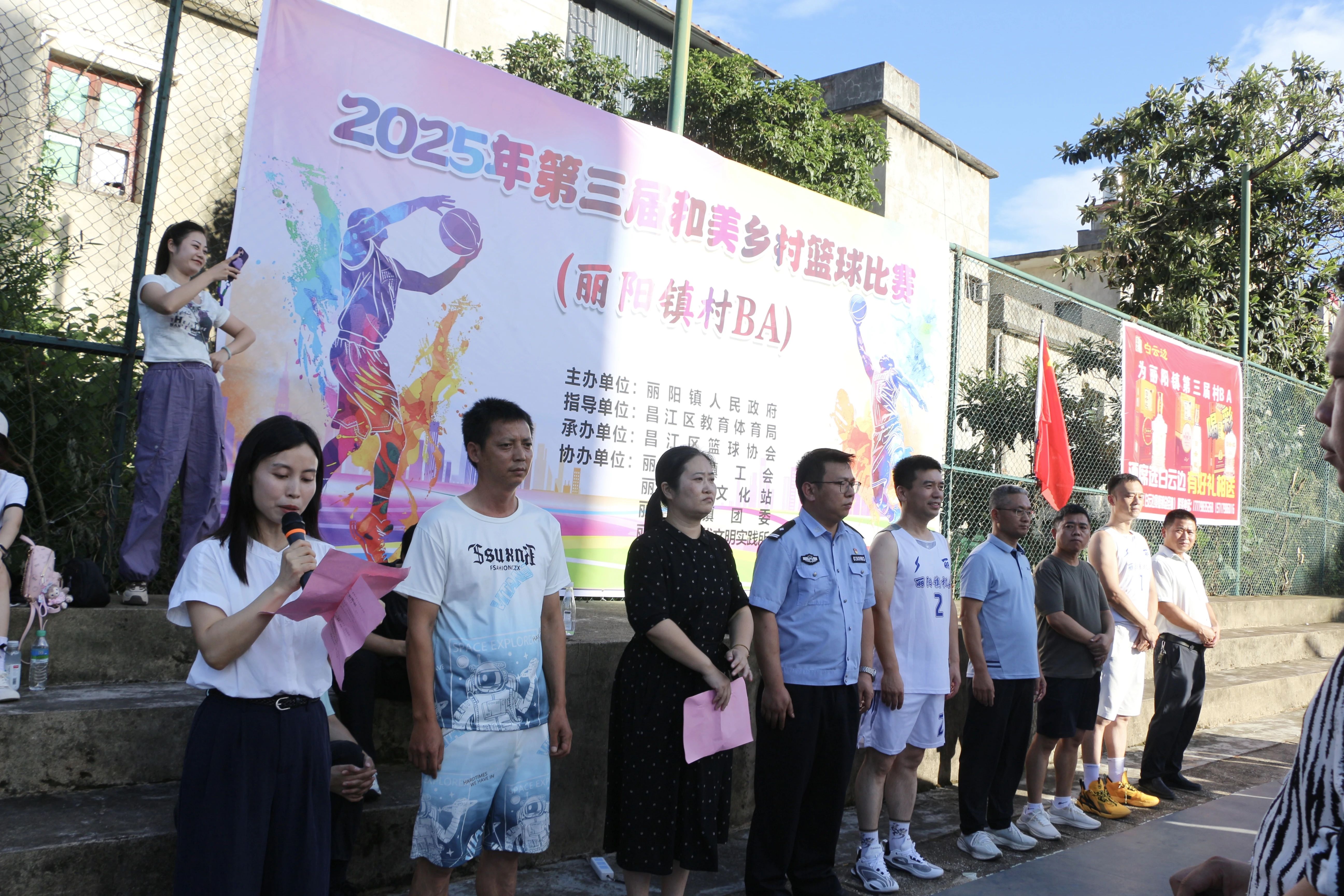 开幕式在庄严的国歌声中拉开序幕,全体人员肃立,奏唱国歌,行注目礼。副镇长程丹致开幕词,勉励全体运动员发扬体育精神,赛出风格、赛出水平。随后,运动员代表及裁判员登台,进行庄严宣誓,承诺恪守规则、公平竞赛。在热烈的掌声与期盼中,镇党委副书记、镇长胡小敏宣布:“丽阳镇第三届‘村BA’篮球赛正式开始”!