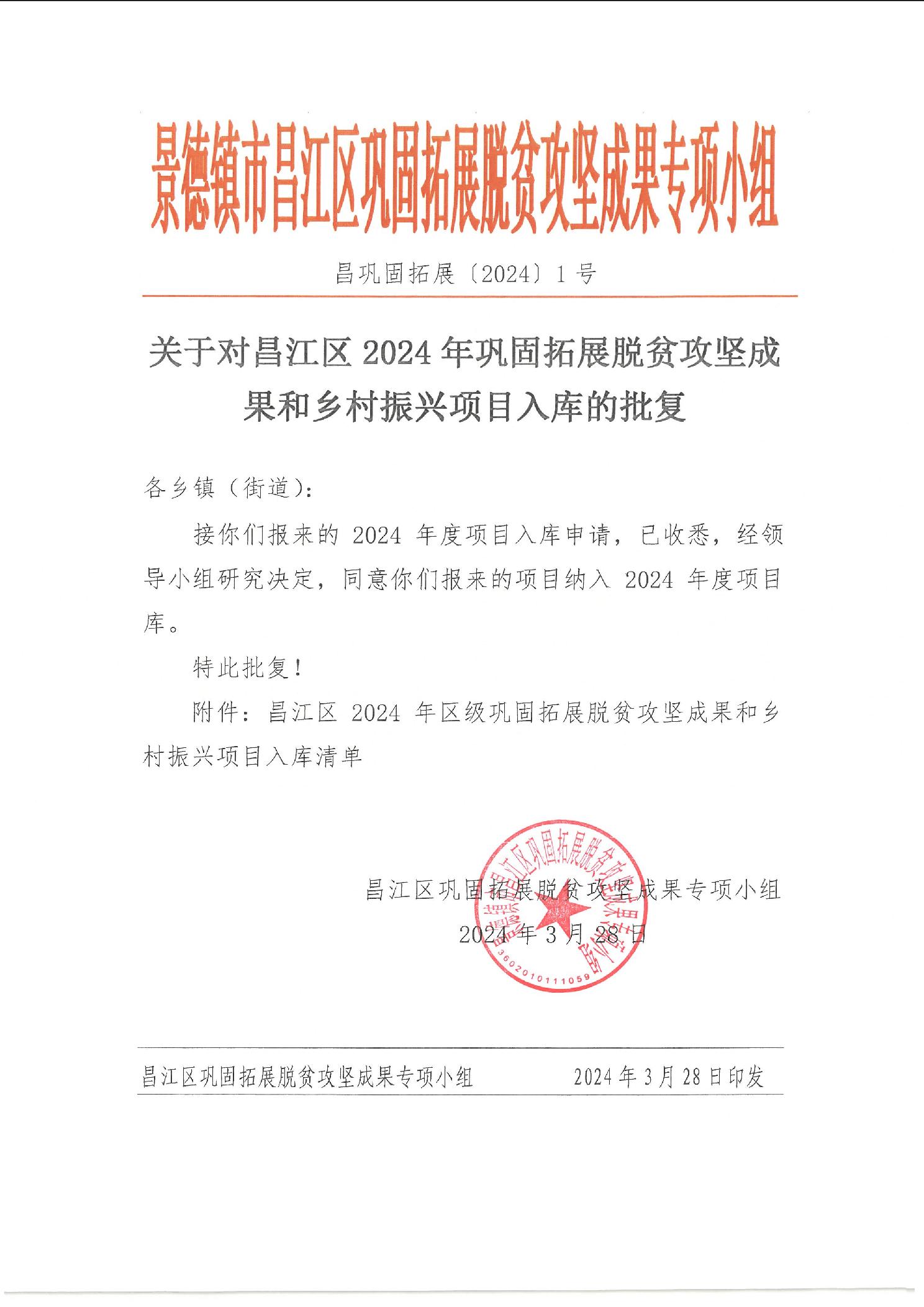 关于对昌江区2024年巩固拓展脱贫攻坚结果和乡村振兴项目入库的批复