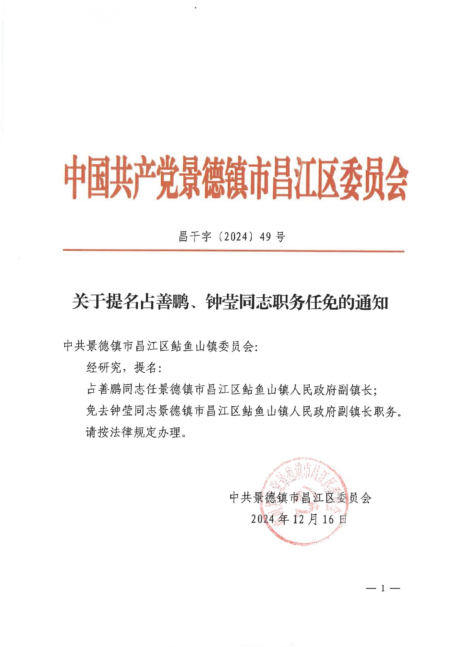 关于提名占善鹏、钟莹同志职务任免的通知
