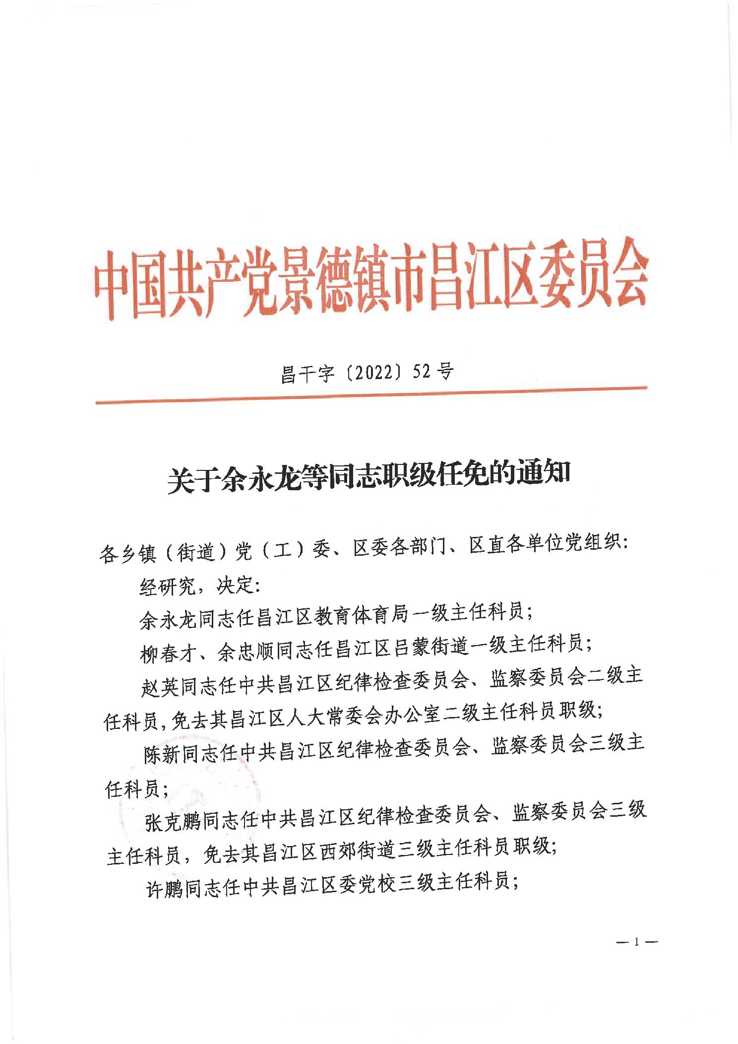 关于余永龙等同志职级任免的通知