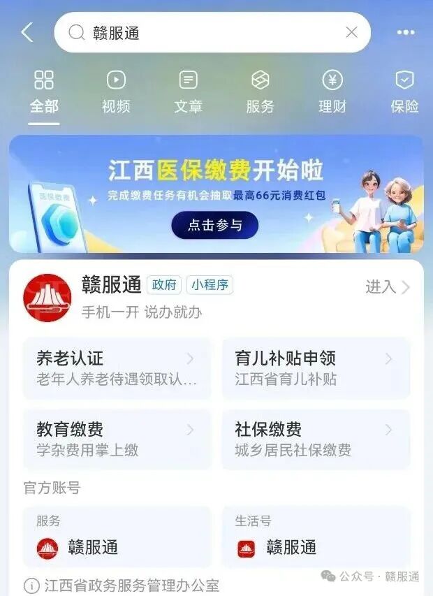 1.在应用市场下载“赣服通”APP或在支付宝搜索“赣服通”小程序进入平台。