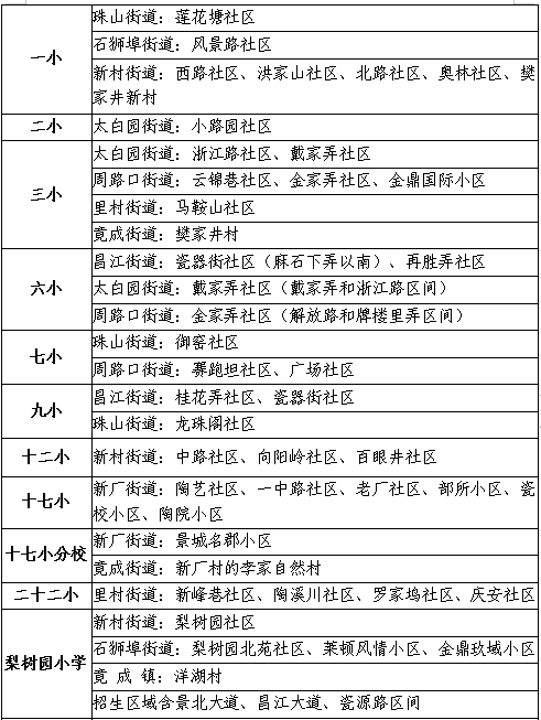 今年纳入对口直升的学校有:昌河小学(对口直升昌河中学)、五中、游泳学校(含原九中小学部,对口直升九中)、十六中、十七中、十九中、二十六中、珠山实验学校、昌江实验学校、十二中。