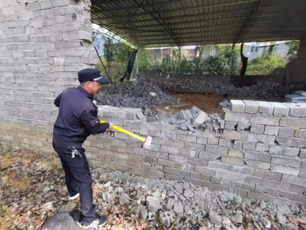拆违现场,工作人员设置了安全警戒线,对闲杂人员进行劝离,随后按照"两违"建筑的结构情况,以人工破拆和机械挖掘的方式有序进行,确保在整个拆违过程安全有序。