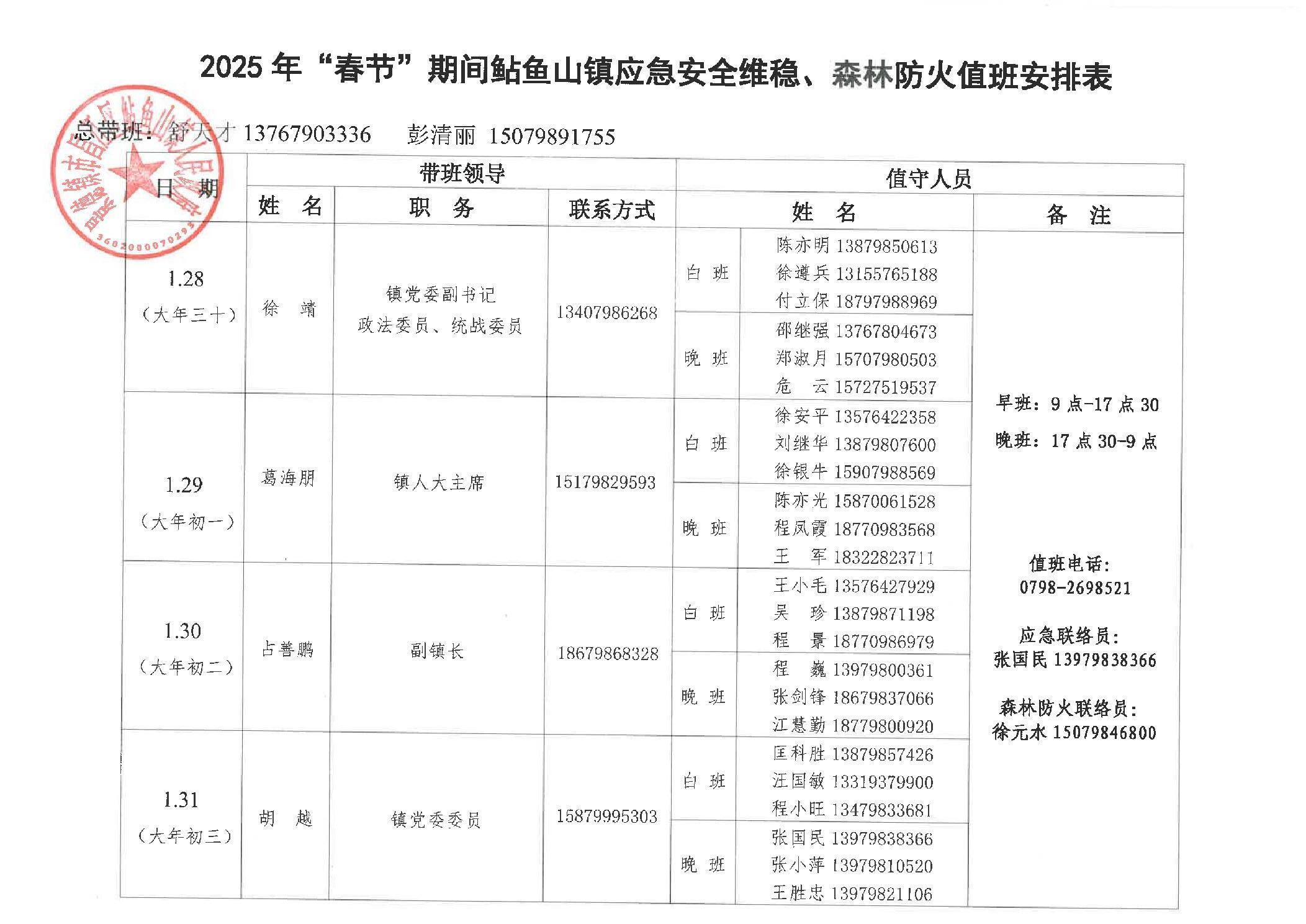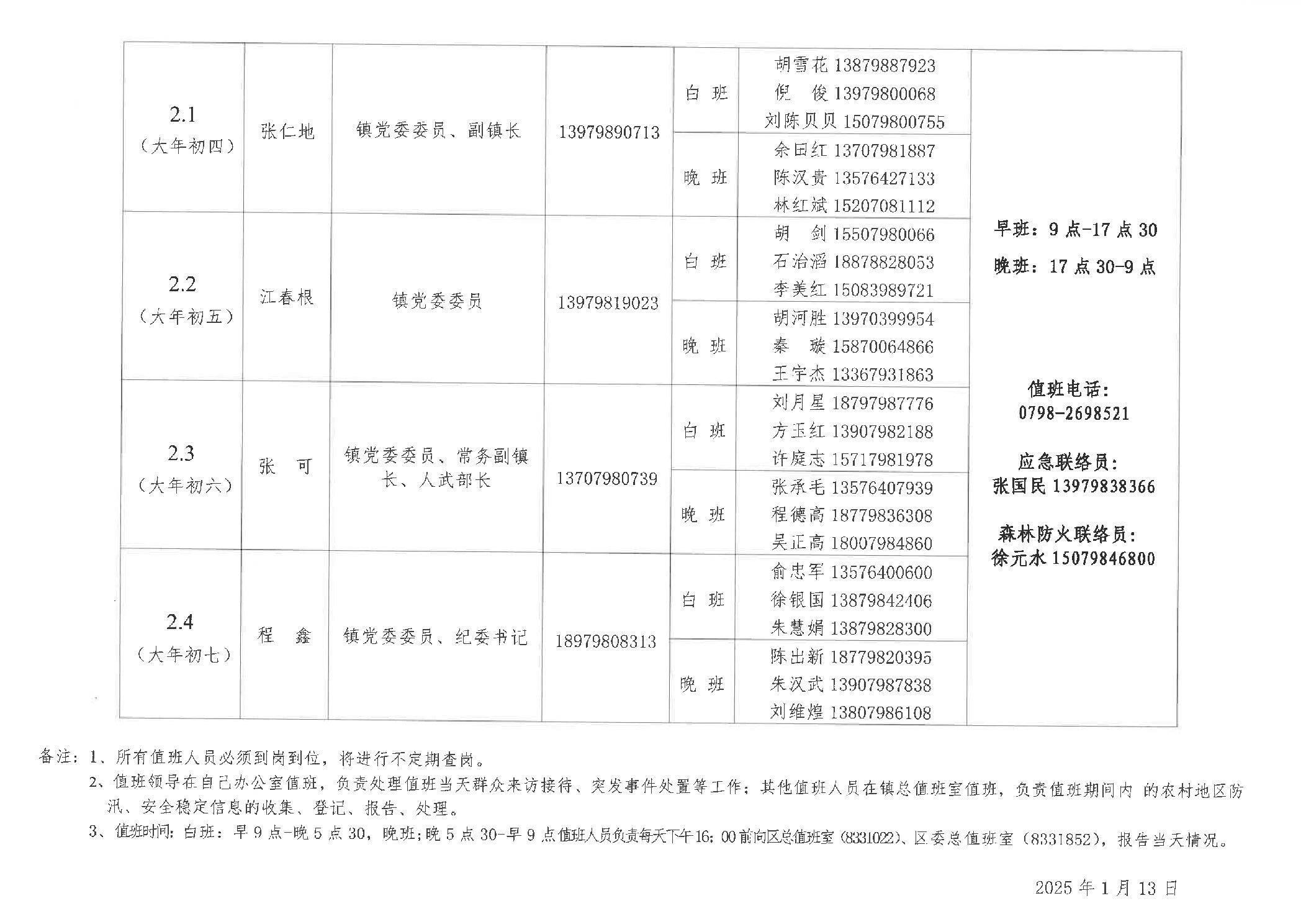 2025年“春节”期间鲇鱼山镇应急安全维稳、森林防火值班安排表