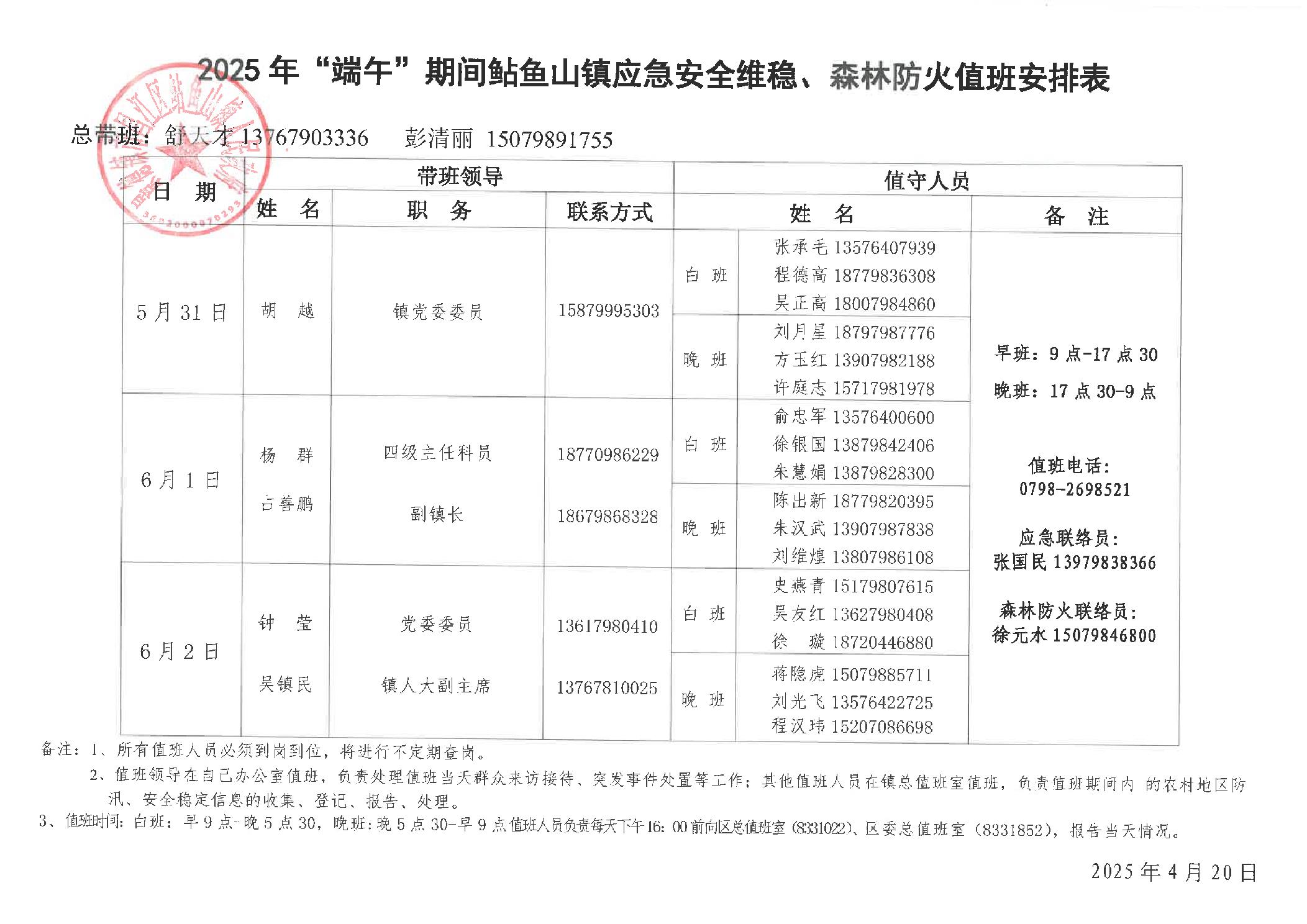 2025年“端午”期间鲇鱼山镇应急安全维稳、森林防火值班安排表