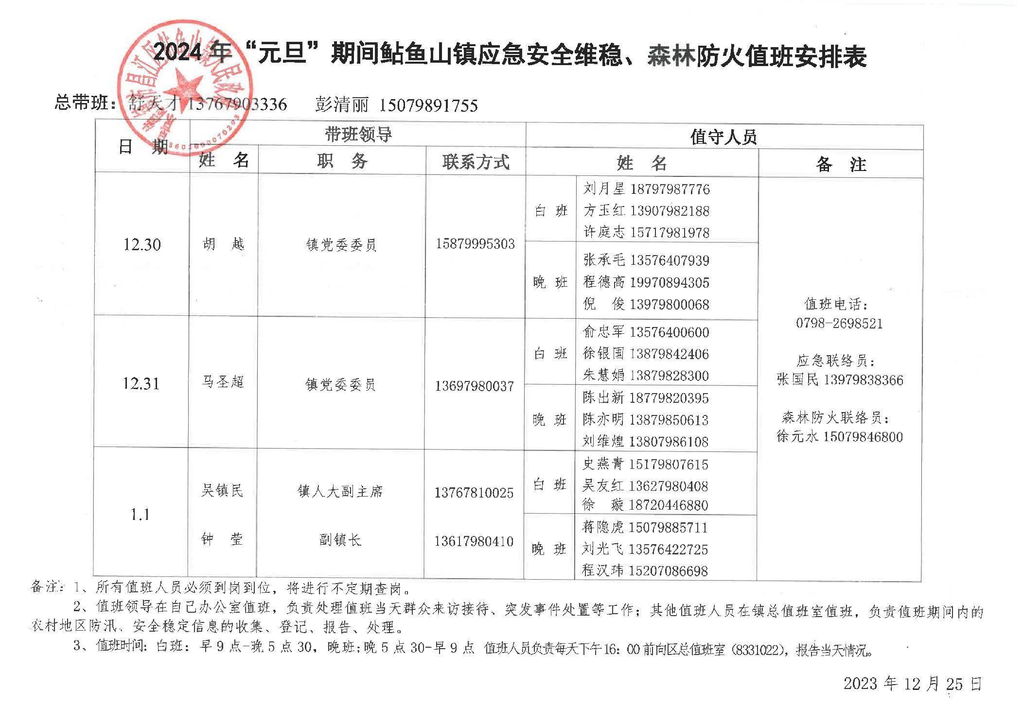 2024年“元旦”期间鲇鱼山镇应急安全维稳、森林防火值班安排表