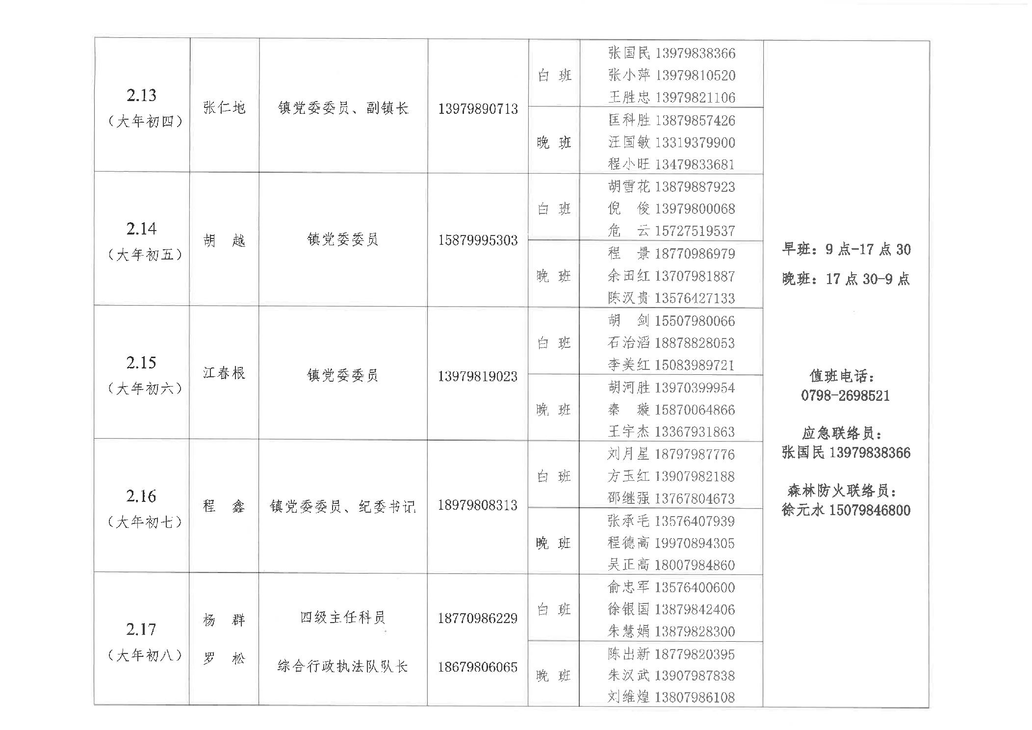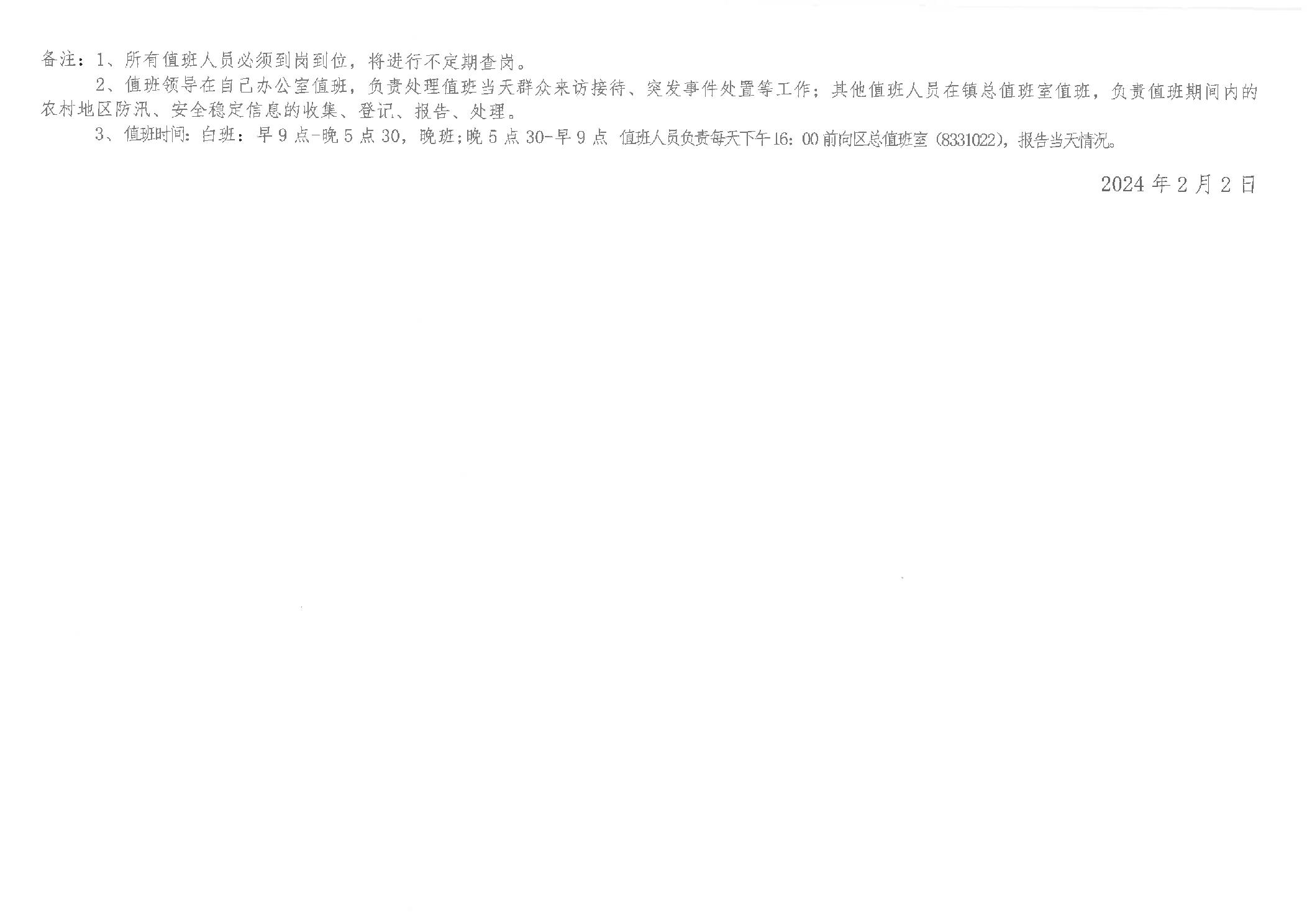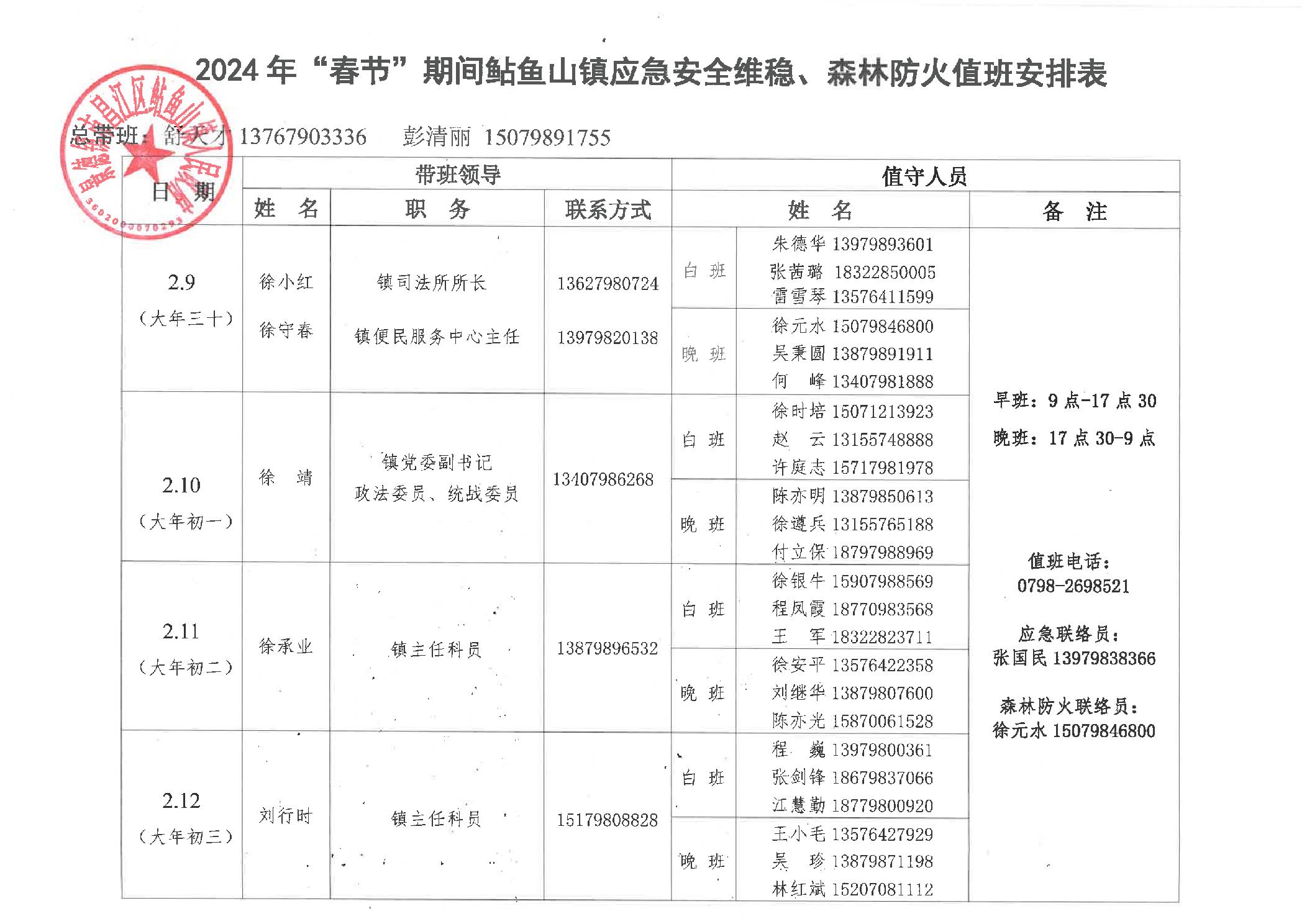 鲇鱼山镇2024年“春节”期间应急安全维稳、森林防火值班安排表