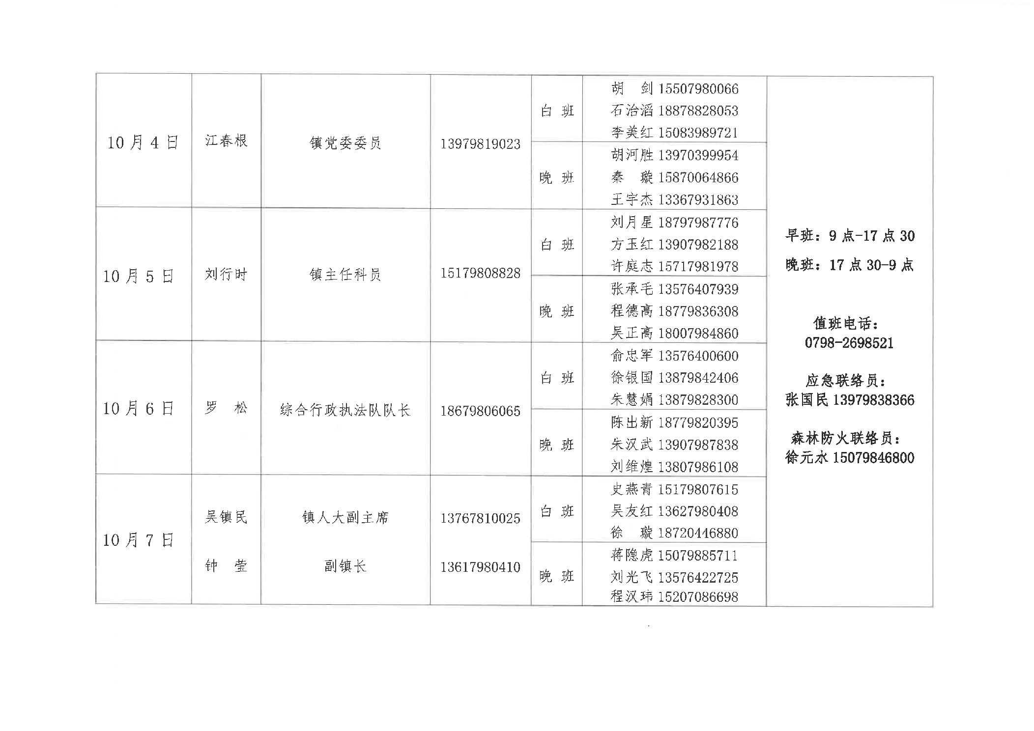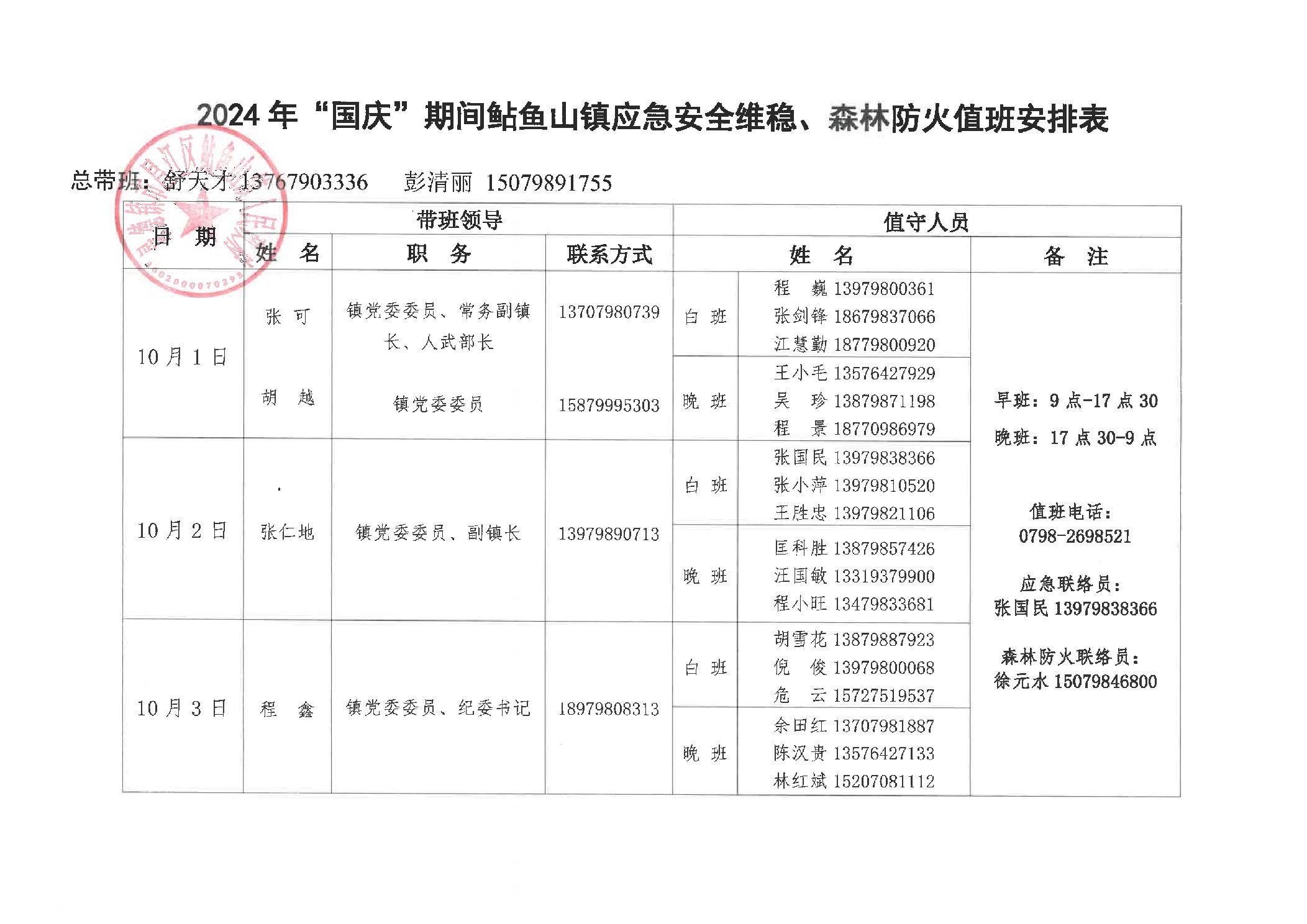 鲇鱼山镇2024年“国庆”期间应急安全维稳、森林防火值班安排表