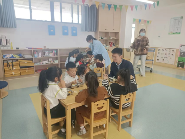 鲇鱼山镇党委委员、纪委书记程沛轩携昌江区市场监管局鱼山分局、镇平安法治办公室应急工作人员到鱼山中心幼儿园开展食堂食品安全排查并参加幼儿园陪餐活动