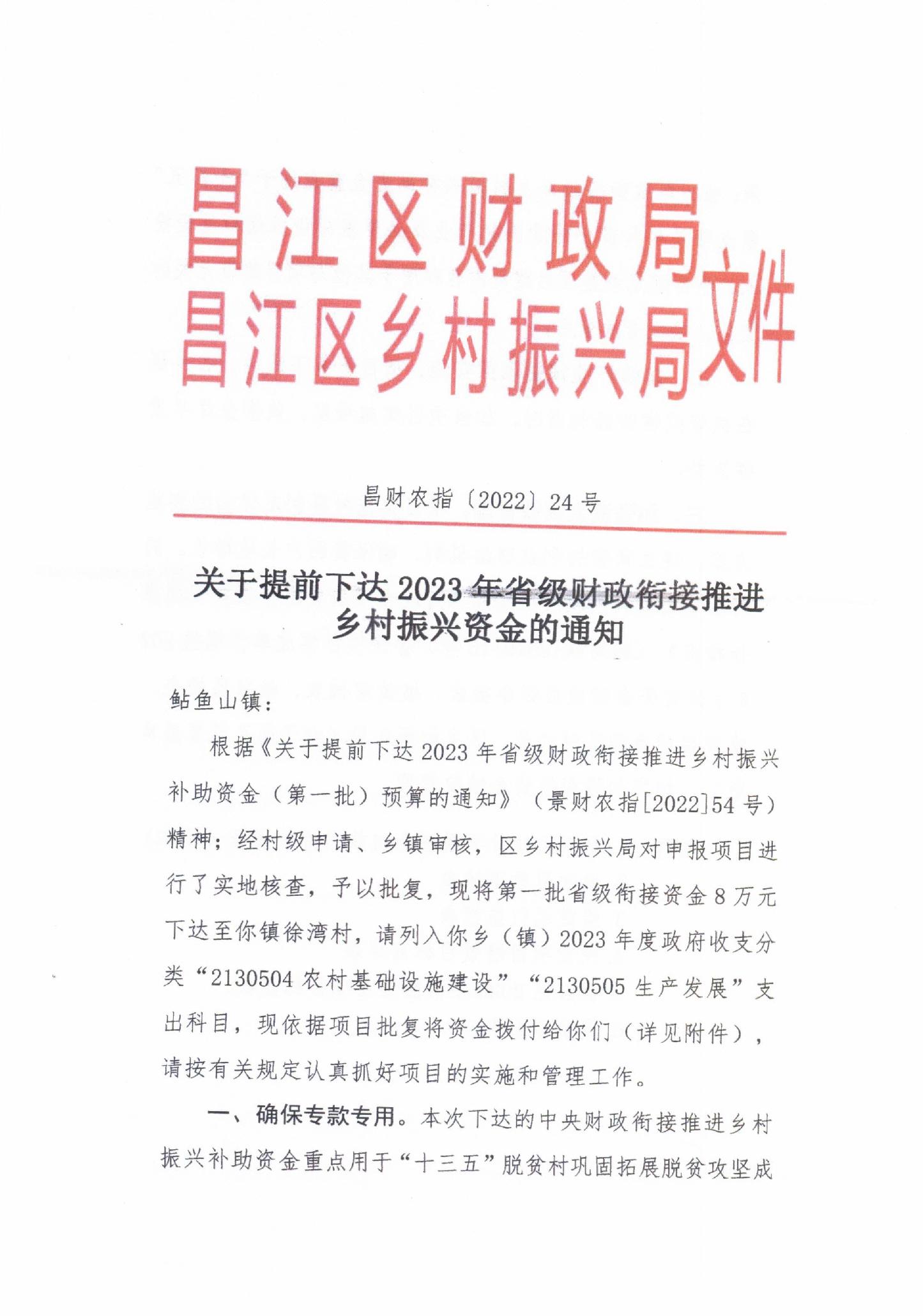 关于提前下达2023年省级财政衔接推进乡村振兴资金的通知 昌财农指[2022]24号