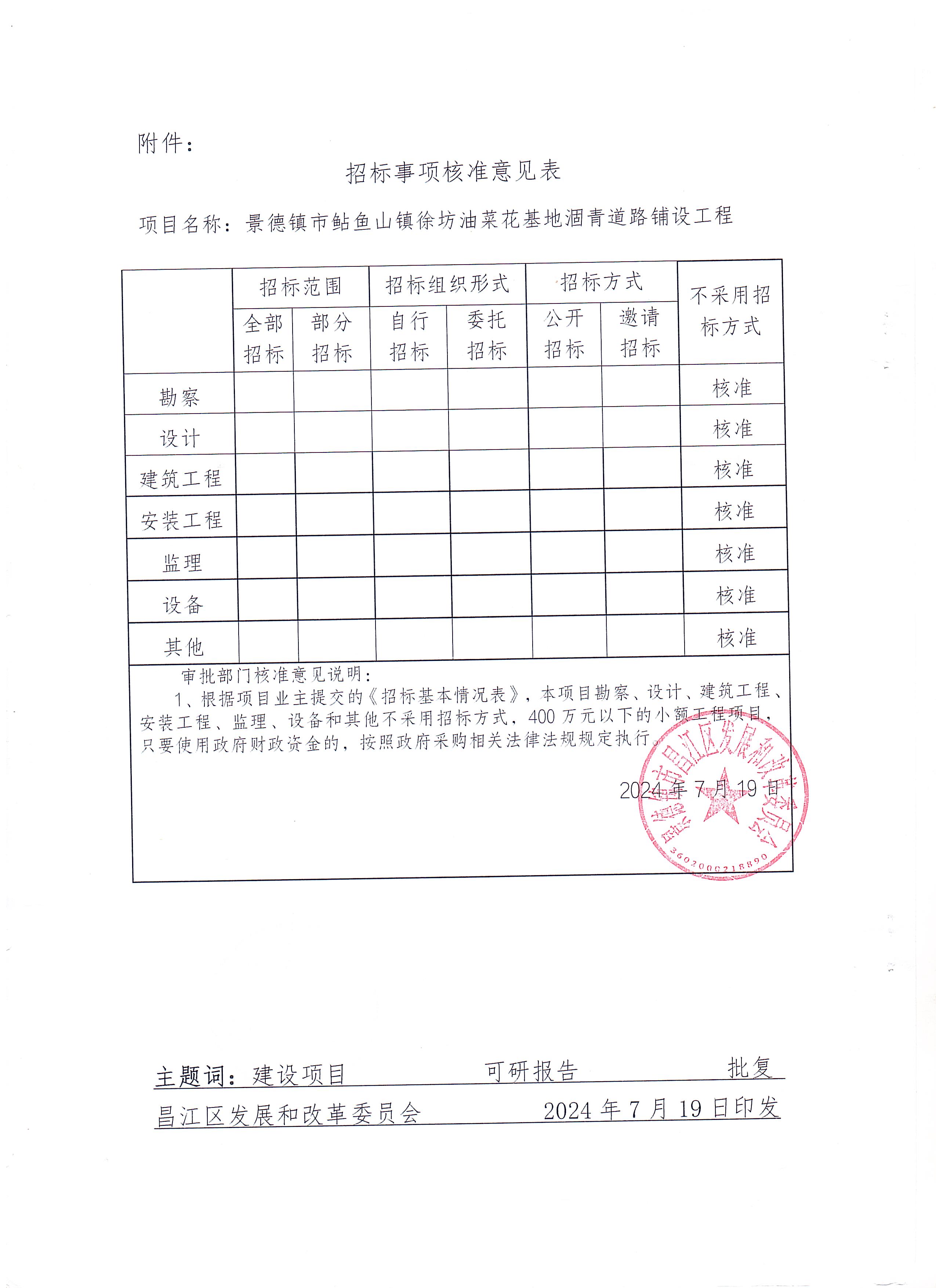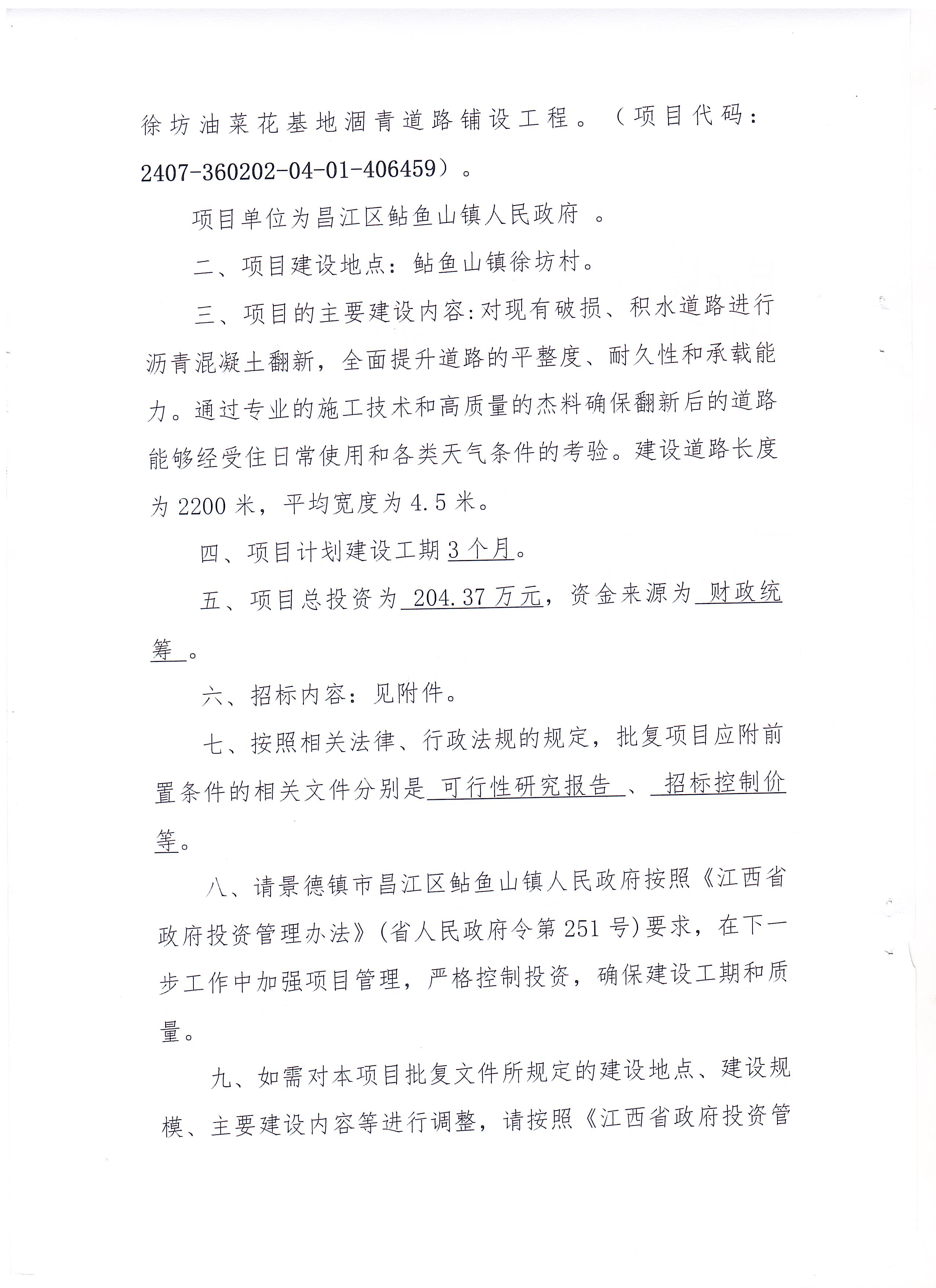 关于景德镇市鲇鱼山镇徐坊油菜花基地涸青道路铺设工程项目可行性研究报告的批复