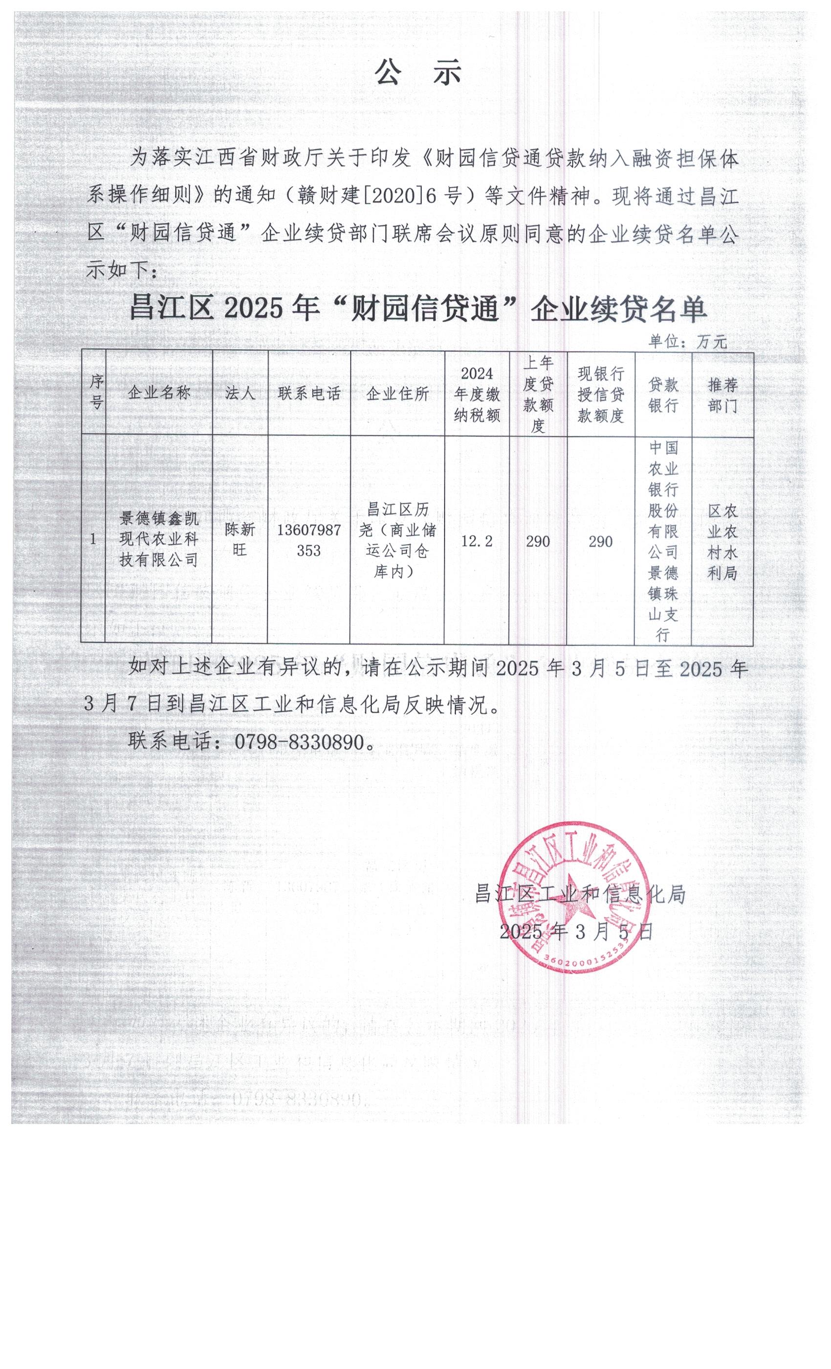 昌江区2025年“财园信贷通”续贷企业名单公示