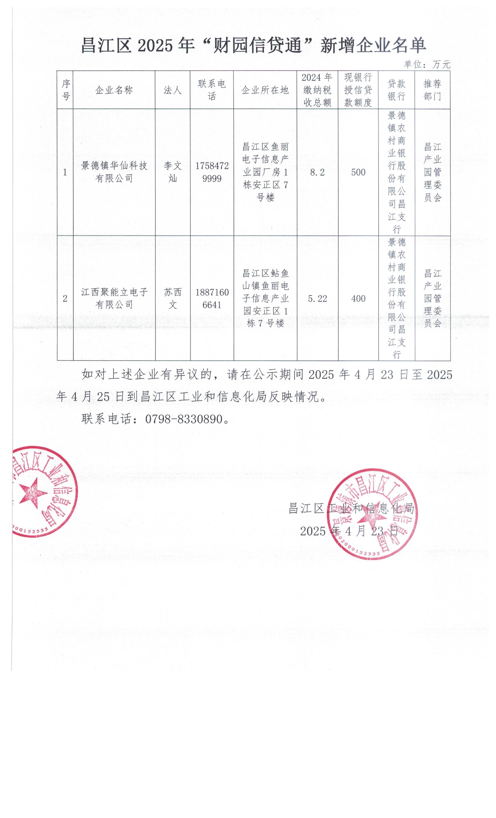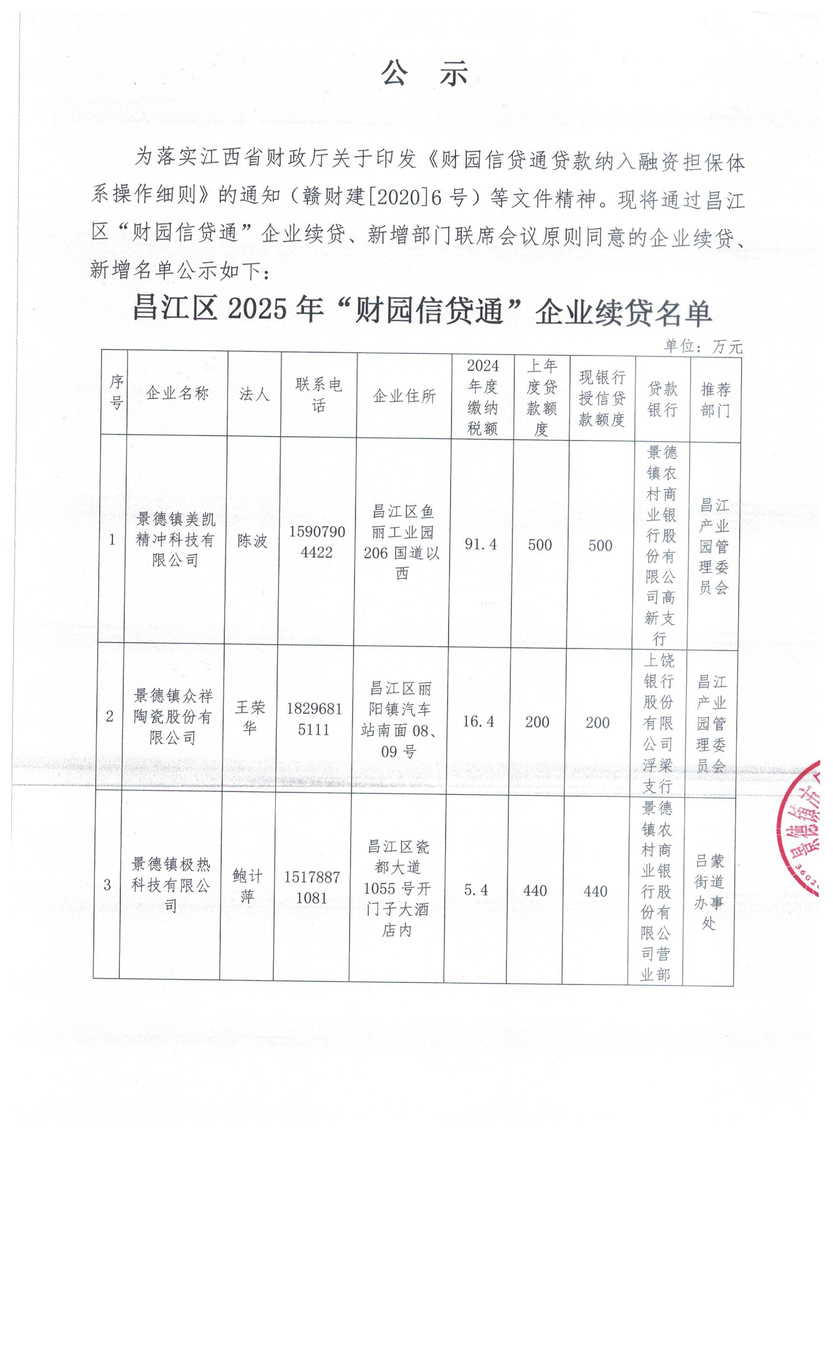昌江区2025年“财园信贷通”续贷企业及新增企业名单公示