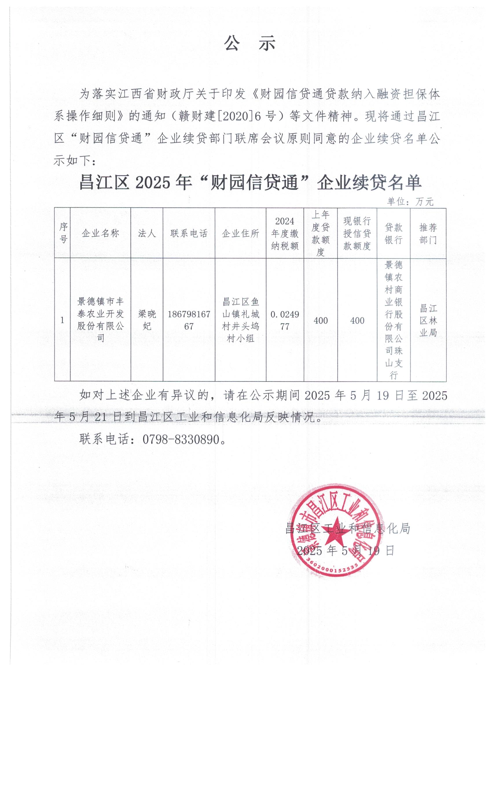 昌江区2025年“财园信贷通”企业续贷名单公示