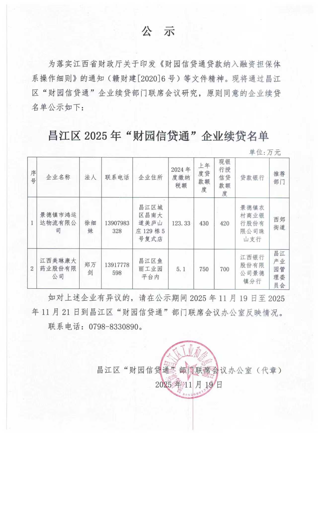 昌江区2025年“财园信贷通”企业续贷名单公示