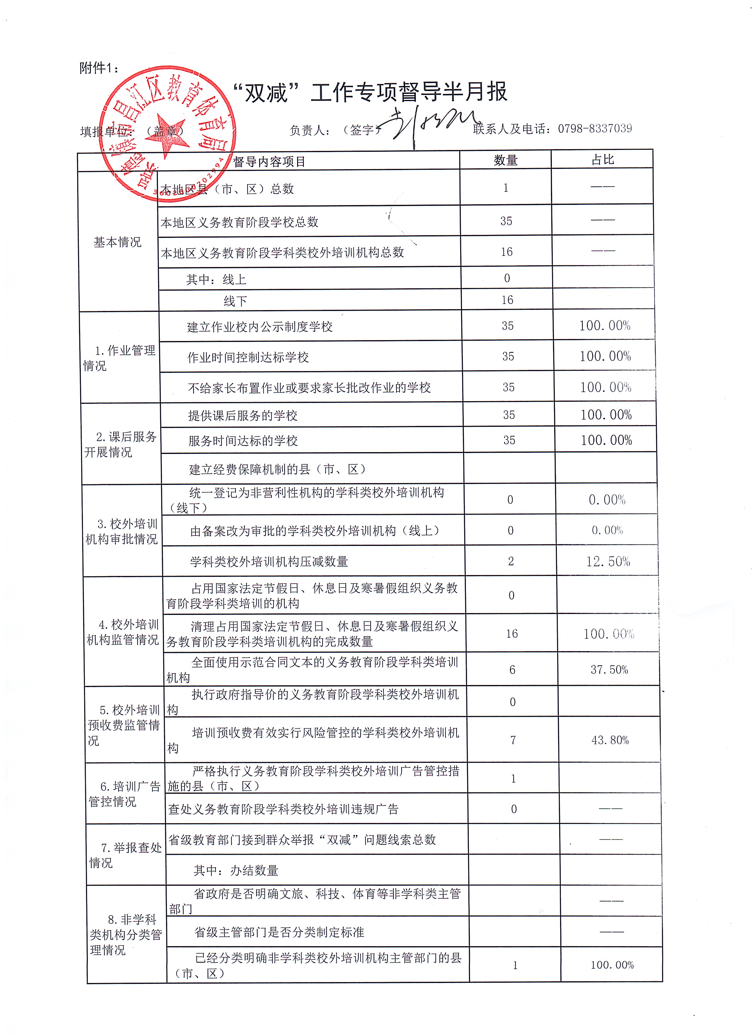 为贯彻落实中共中央办公厅、国务院办公厅《关于进一步减轻义务教育阶段学生作业负担和校外培训负担的意见》按照国务院教育督导办印发《关于建立“双减”工作专项督导半月通报制度的通知》国教督办函[2021]51号要求,现将昌江区“双减”工作专项督导半月报11月份第一期进行公示。