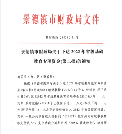 景德镇市财政局关于下达2022年省级基础教育专项资金(第二批)的通知