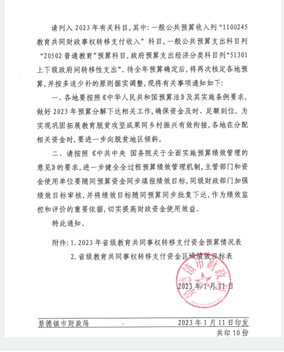 景德镇市财政局关于下达2023年省级教育共同事权转移支付资金预算的通知