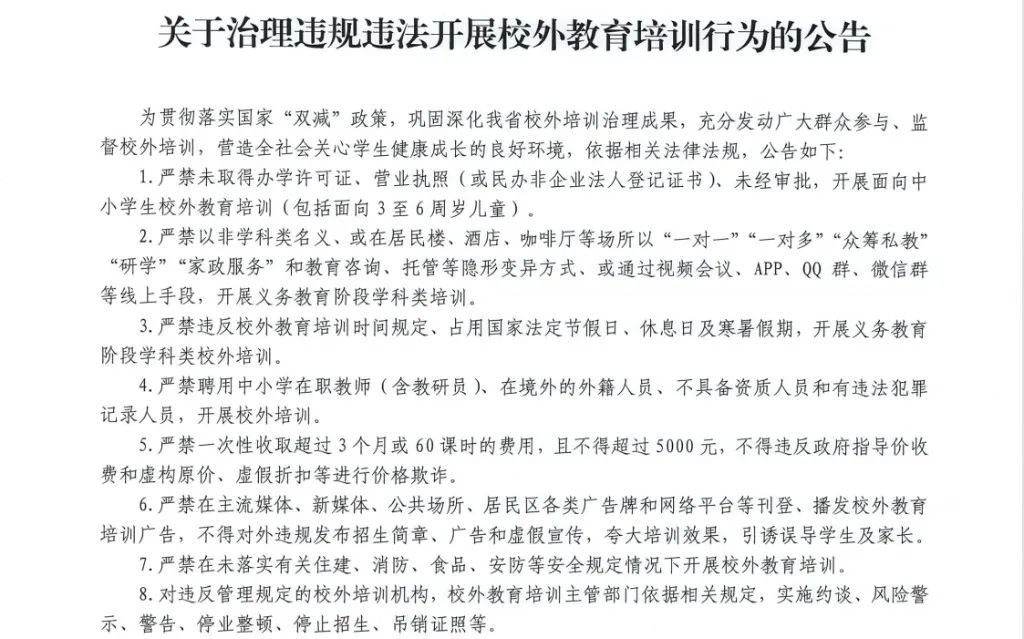 1月30日,江西省《关于治理违规违法开展校外教育培训行为的公告》(以下简称《公告》)正式印发,《公告》以十个重点治理问题为“靶子”,打响新年校外培训治理“第一枪”。