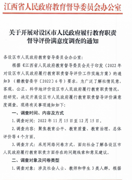 【已结束】关于开展2022年对设区市人民政府履行教育职责督导评价满意度调查的通知