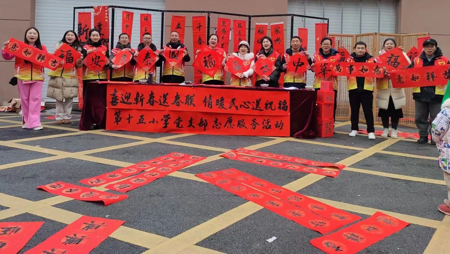 春节将至,年味渐浓,为继承和发扬中华传统节日优秀文化,推进文化自信自强,丰富精神文化生活,营造喜庆祥和的春节氛围,2月5日,十五小党支部在社区开展了“喜迎新春送春联 情暖民心送祝福”志愿服务活动。全体党员和部分群众代表参加了此次活动。大家挥毫泼墨,书写对联和福字,把美好的祝福与浓浓的关爱送给社区群众。