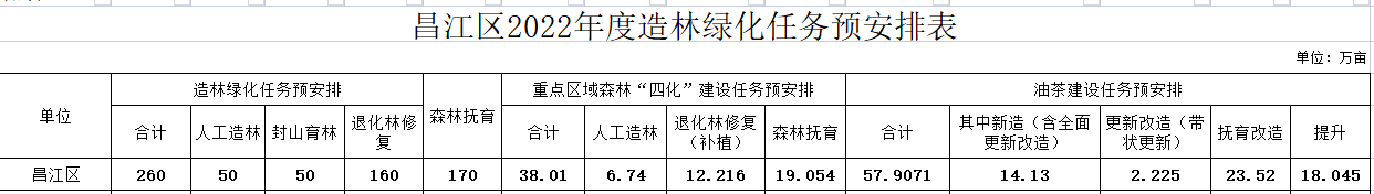 昌江区2022年度造林绿化任务预安排表