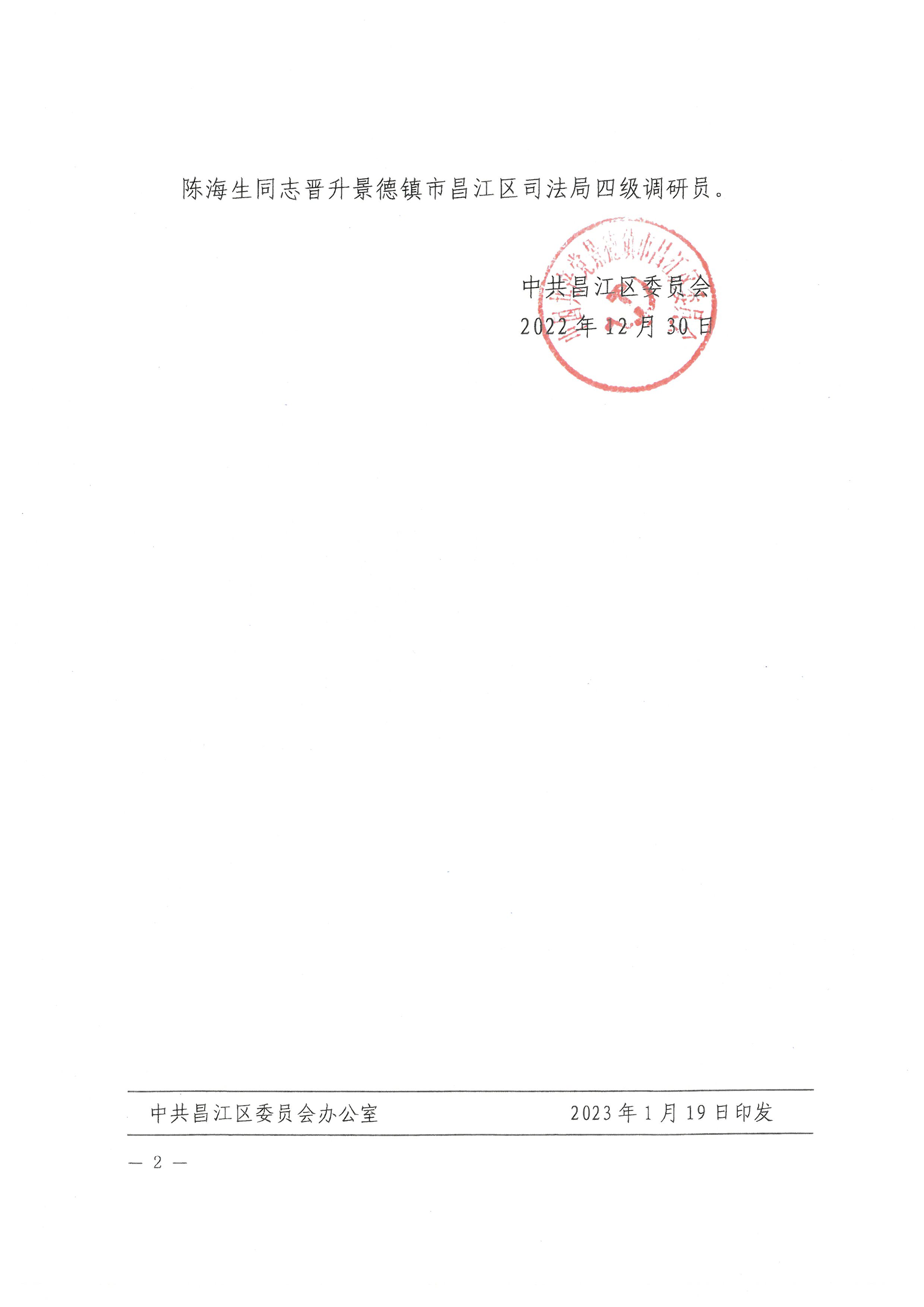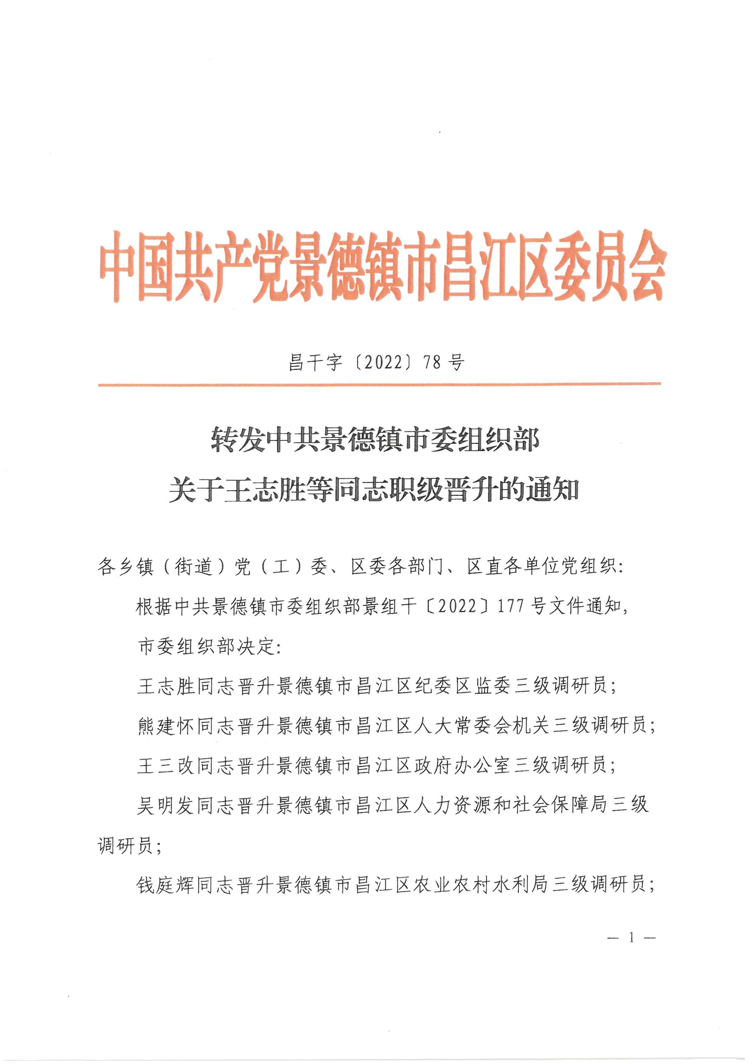 转发中共景德镇市委组织部关于王志胜等同志职级晋升的通知