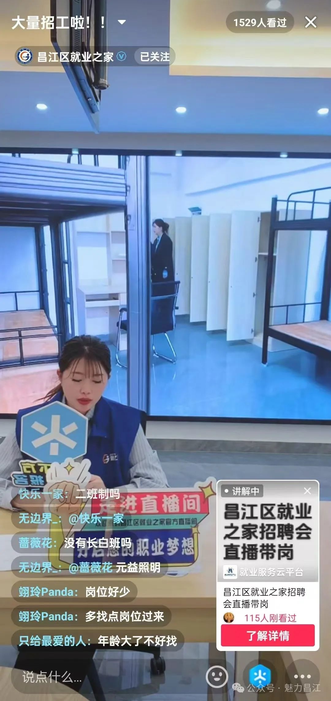 蓬勃发展的直播带岗,成为稳就业、促就业的一剂“良方”。昌江区就业之家打造直播带岗工作室,通过抖音等直播平台开展直播带岗活动,努力实现就业服务“不打烊”。此次夜间专场直播的成功开展,标志着昌江区正式开启“精准化、场景化、全天候”的就业服务模式。