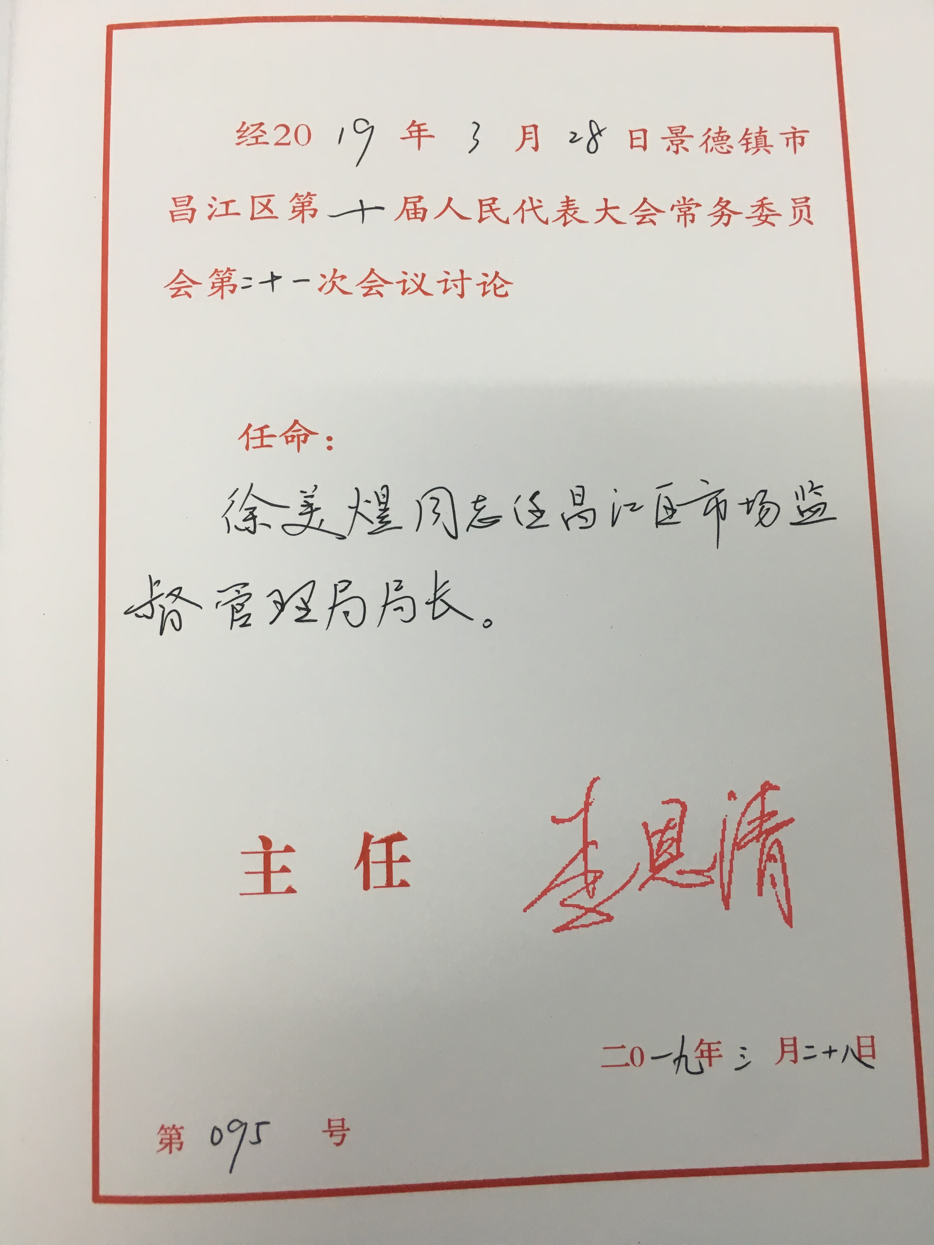 徐美煜同志任昌江区市场监管局局长