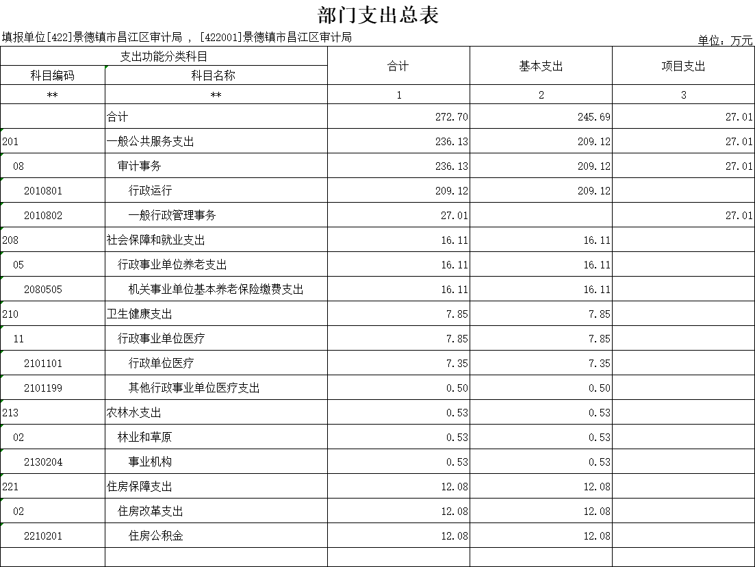 2025年景德镇市昌江区审计局支出预算总额为272.7万元,较上年预算安排增加12.22万元;其中: