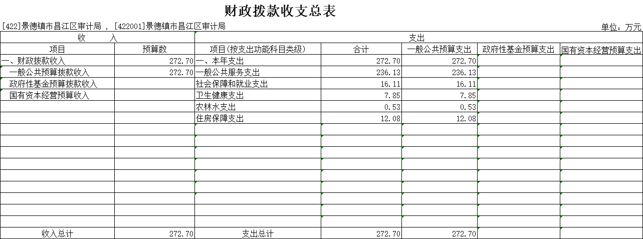 2025年景德镇市昌江区审计局财政拨款支出预算总额272.7万元,较上年预算安排增加29.22万元;其中: