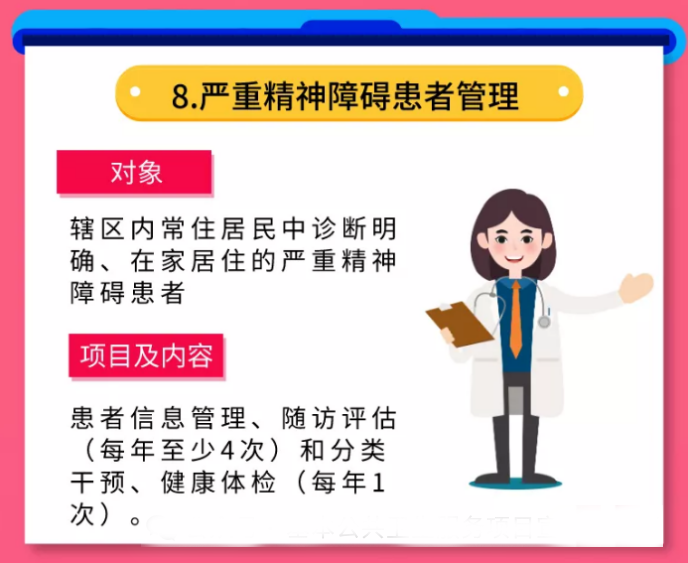 辖区内常住居民中诊断明确、在家居住的严重精神障碍患者。主要包括精神分裂症、分裂情感性障碍、偏执性精神病、双相情感障碍、癫痫所致精神障碍、精神发育迟滞伴发精神障碍。若您有家人或同事为严重精神障碍患者,他可享受每年至少4次随访、健康指导和1次健康体检、评估。