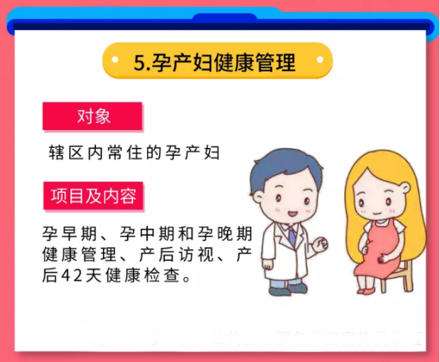 您怀孕后可建立《母子健康手册》,享受5次产前随访、健康指导、健康状况评估和检查,生产后可享受产后访视和产后42天健康检查。