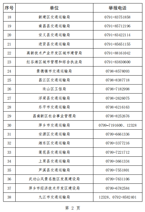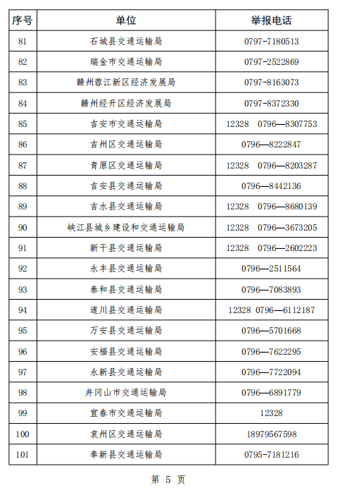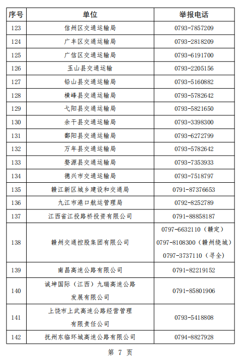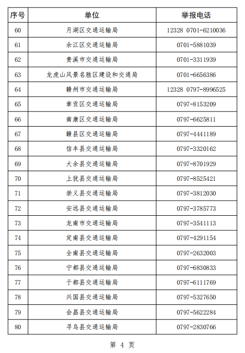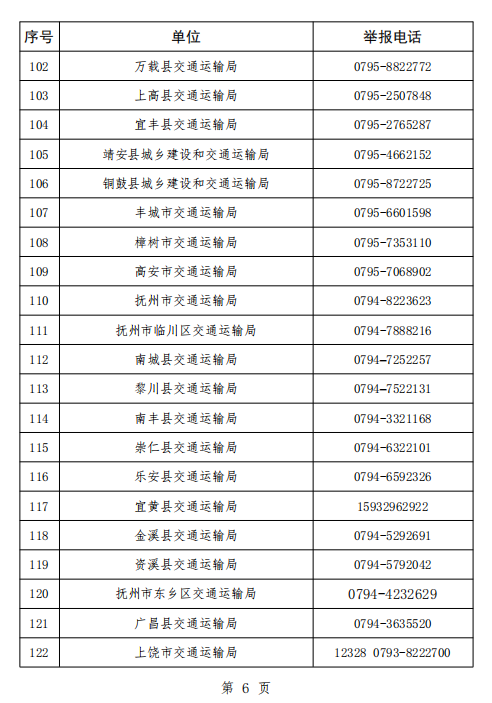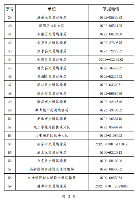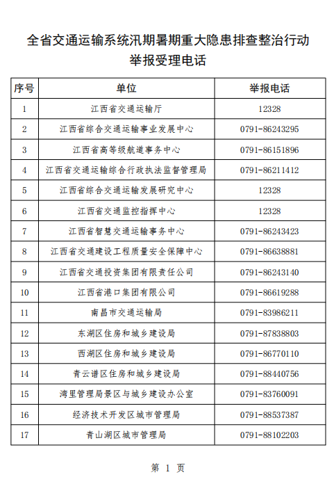 为认真落实交通运输部、省委、省政府关于做好汛期暑期交通运输安全生产工作的部署要求,强化行业安全生产的社会监督,切实保障人民群众生命财产安全和平安出行,畅通投诉举报渠道,现将全省交通运输部门安全生产举报电话公布如下: