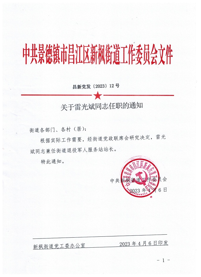 关于雷光斌同志任职的通知